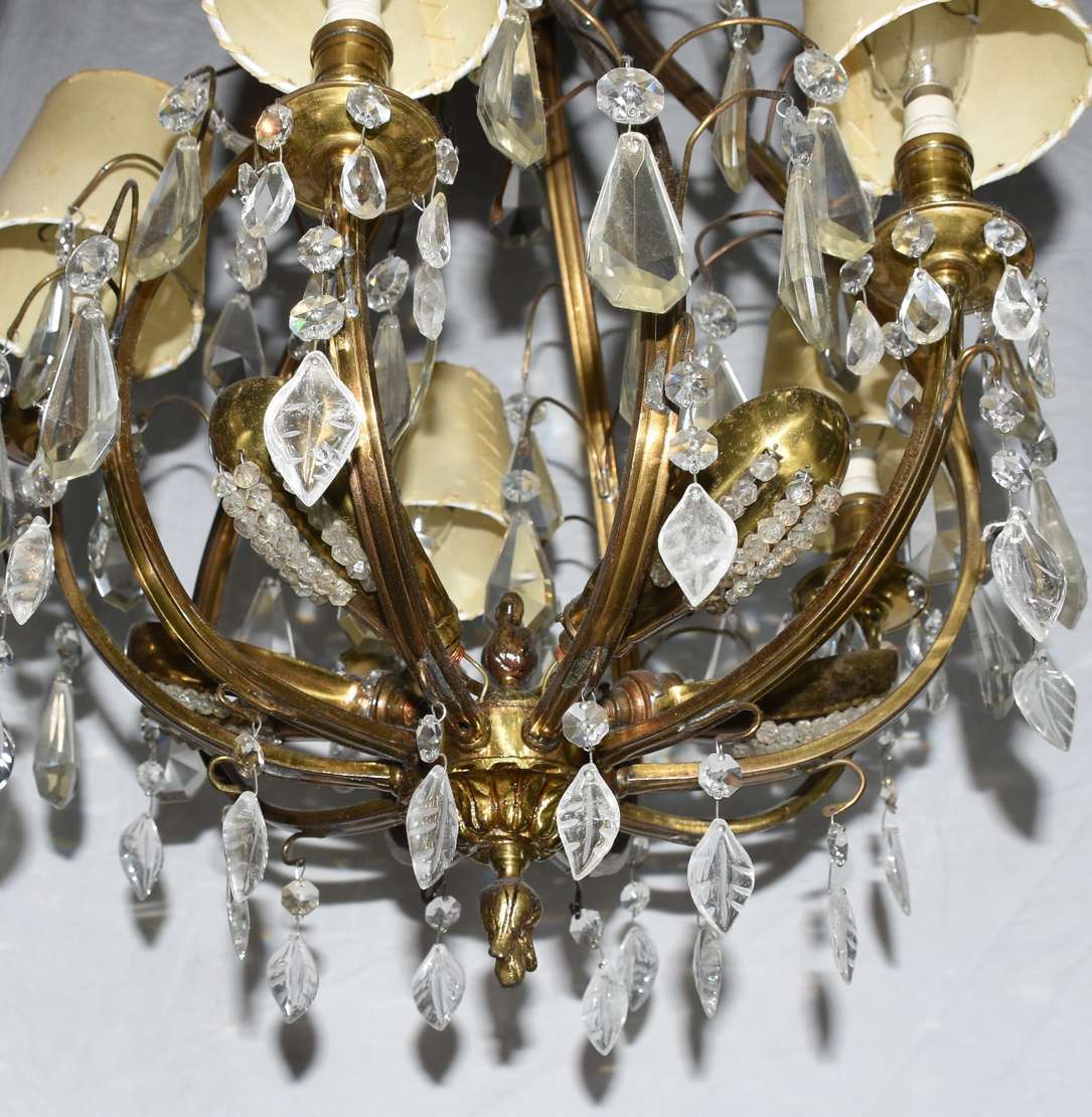 Lustre de cristal para 6 luzes com pingentes e mangas lapidadas. (faltando alguns pingentes, arames oxidados e uma da...