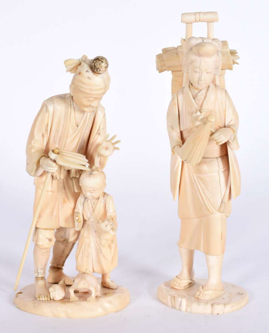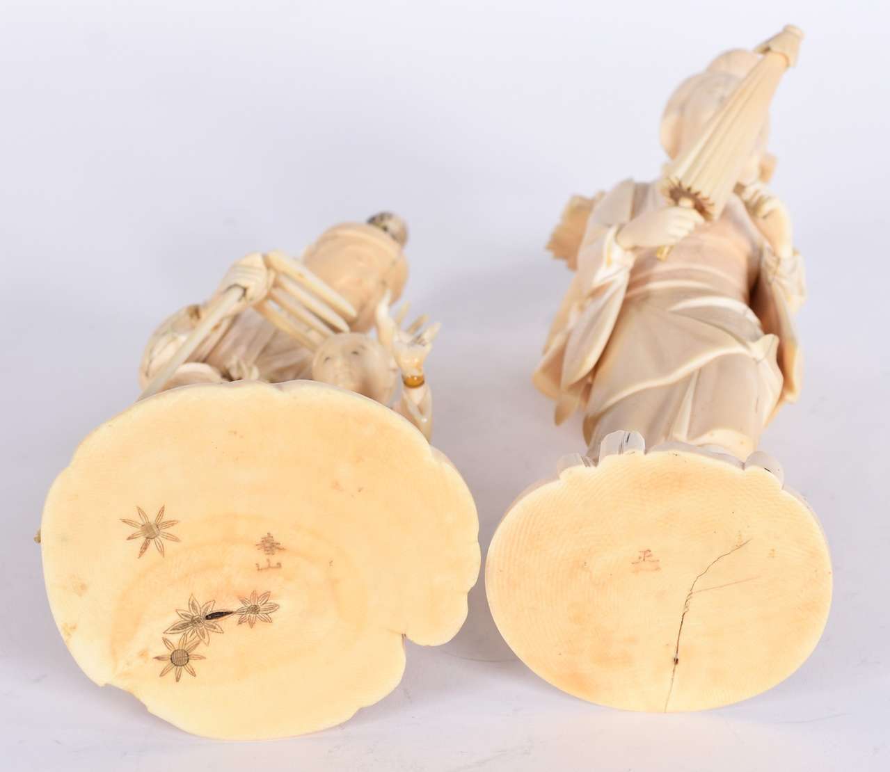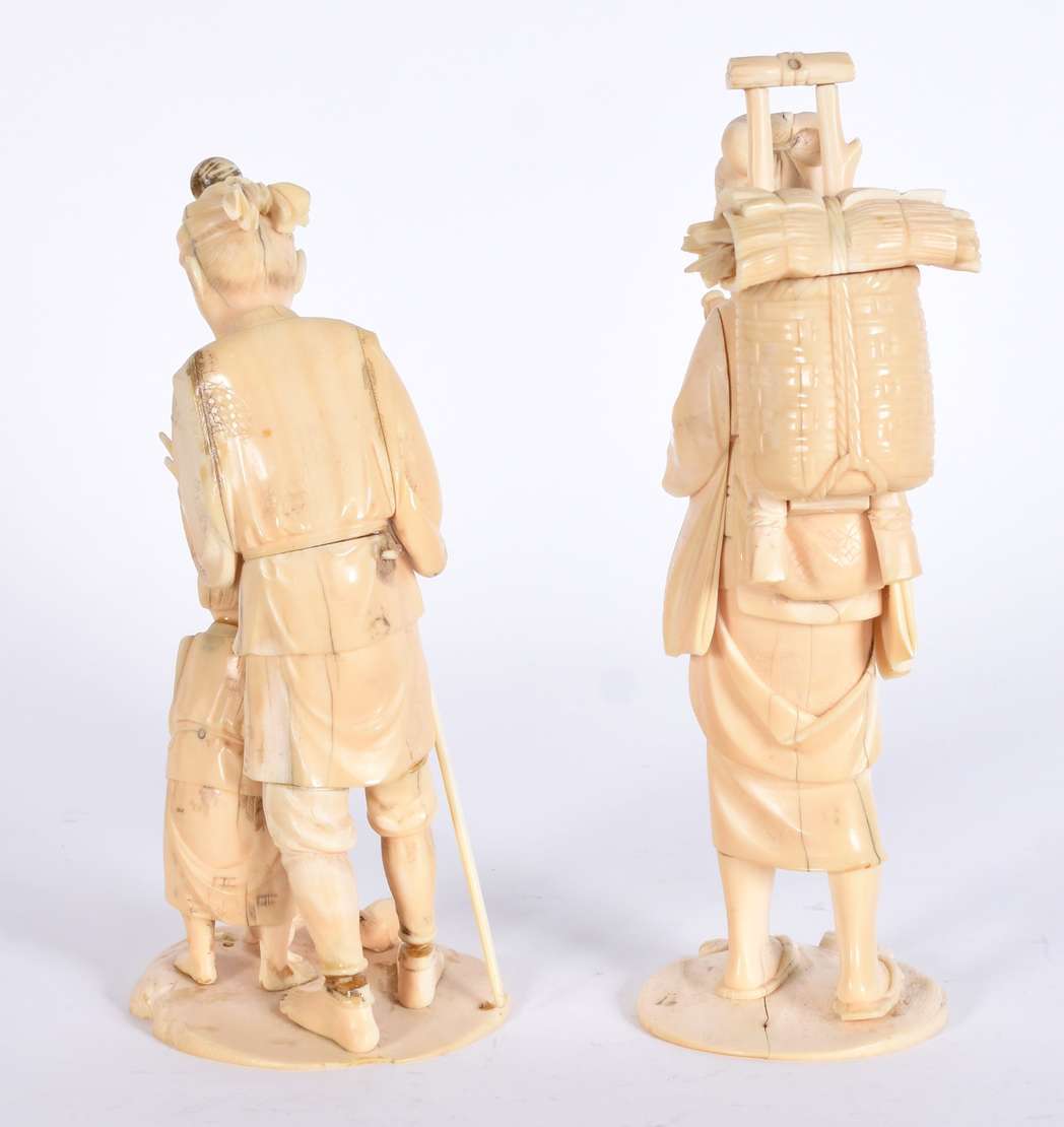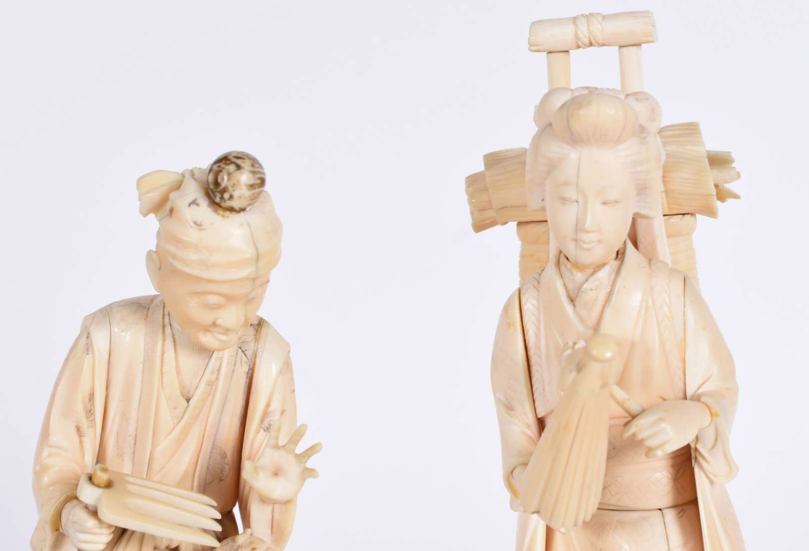 Par de estatuetas de marfim oriental esculpidas com figuras e vazados.