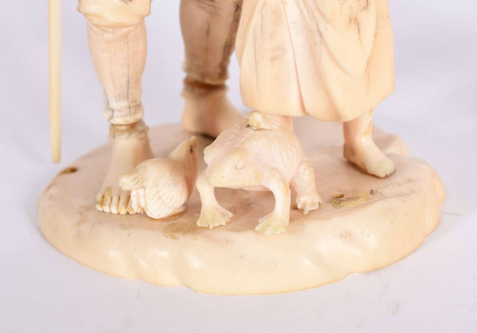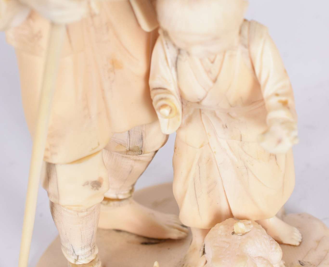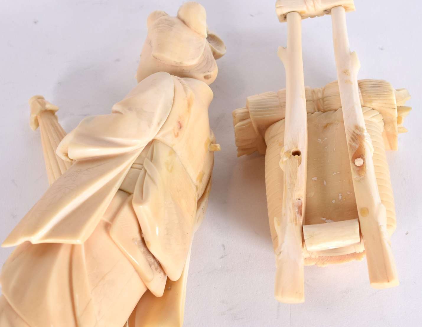 Par de estatuetas de marfim oriental esculpidas com figuras e vazados.