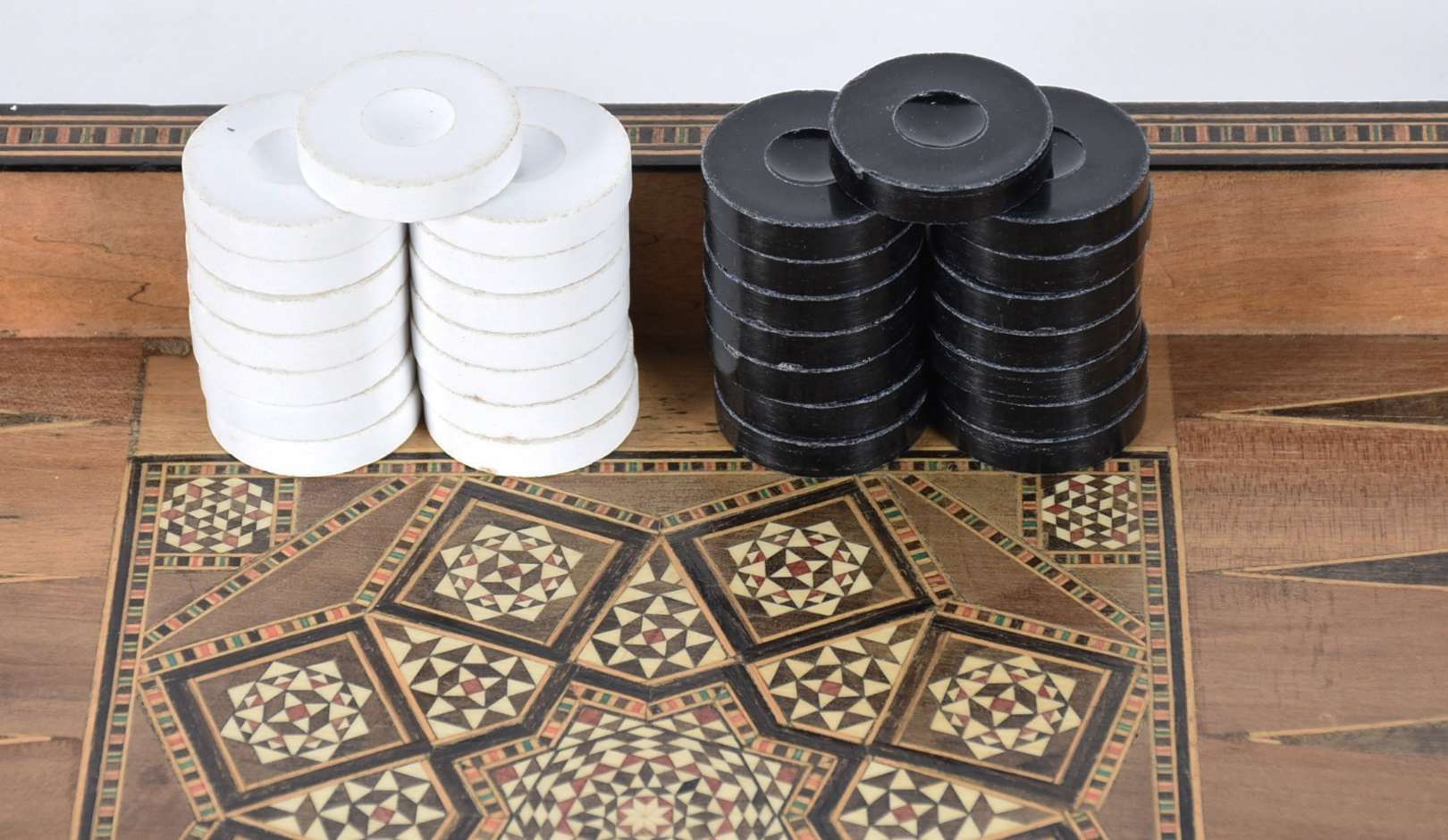 Jogo de gamão com estojo de madeira marchetada, dobrável, acompanham as peças e dados.