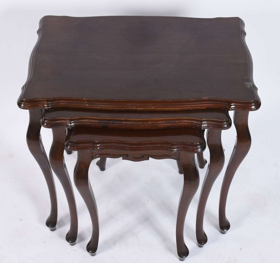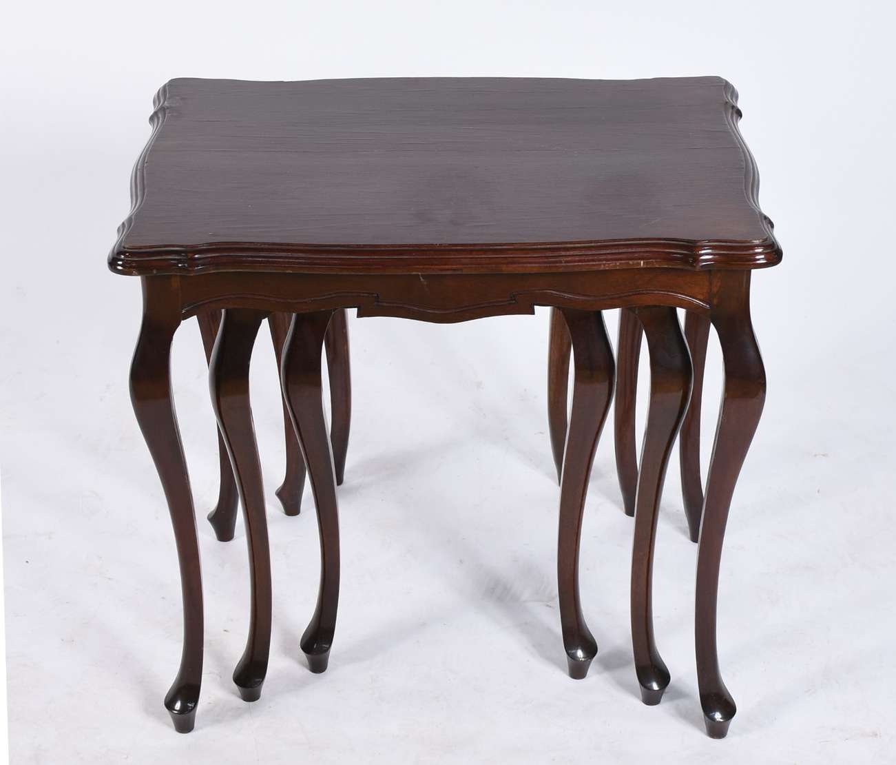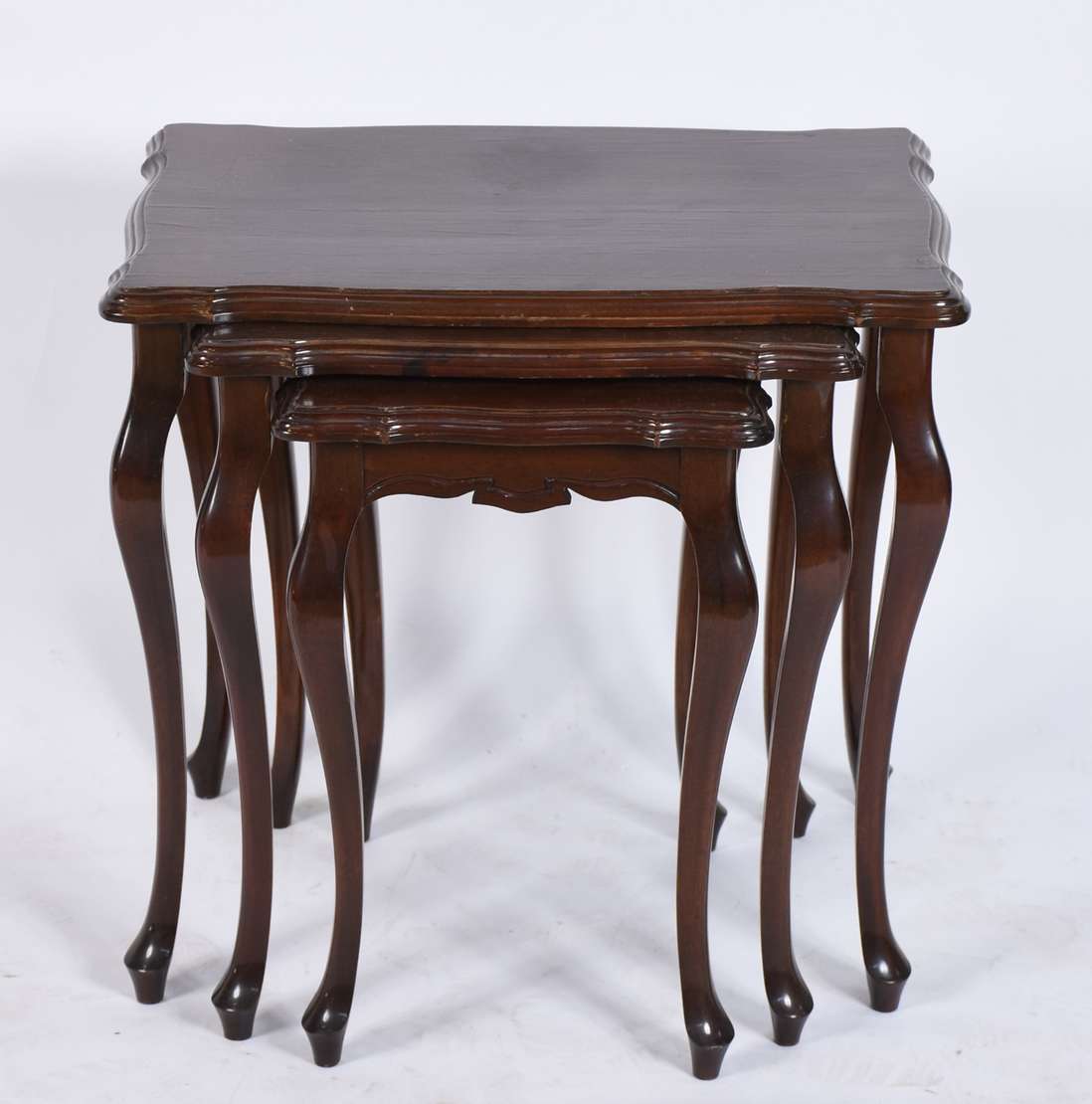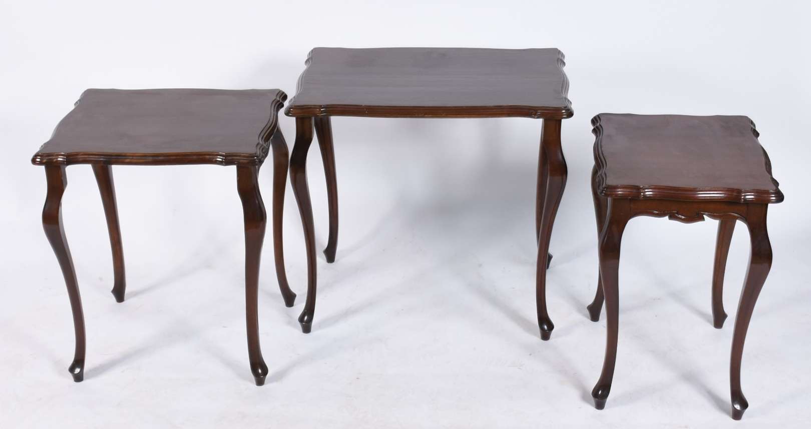 Conjunto de tres mesas de cerejeira, sendo uma de centro e par de laterais, saias recortadas com entalhes e vazados, ...