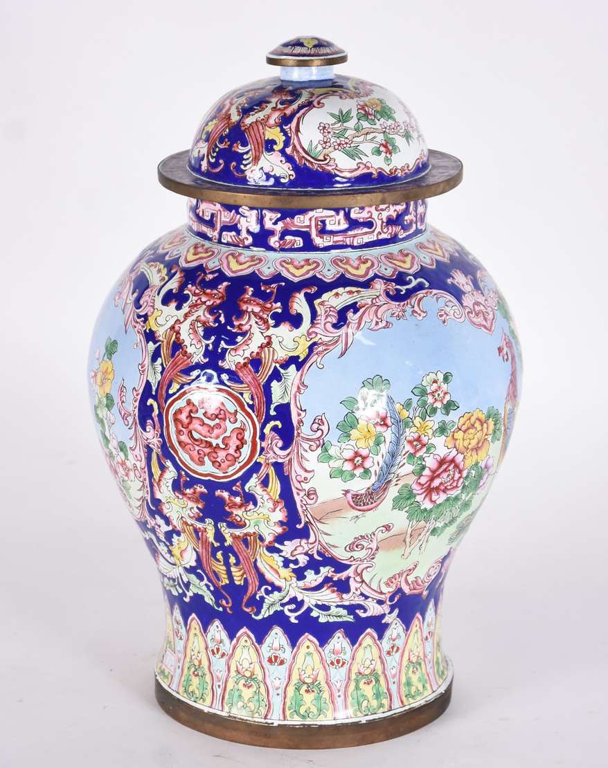 Par de urnas com tampas em porcelana europeia, de formato balaústre, ornadas em esmaltes policromados com flores e fr...