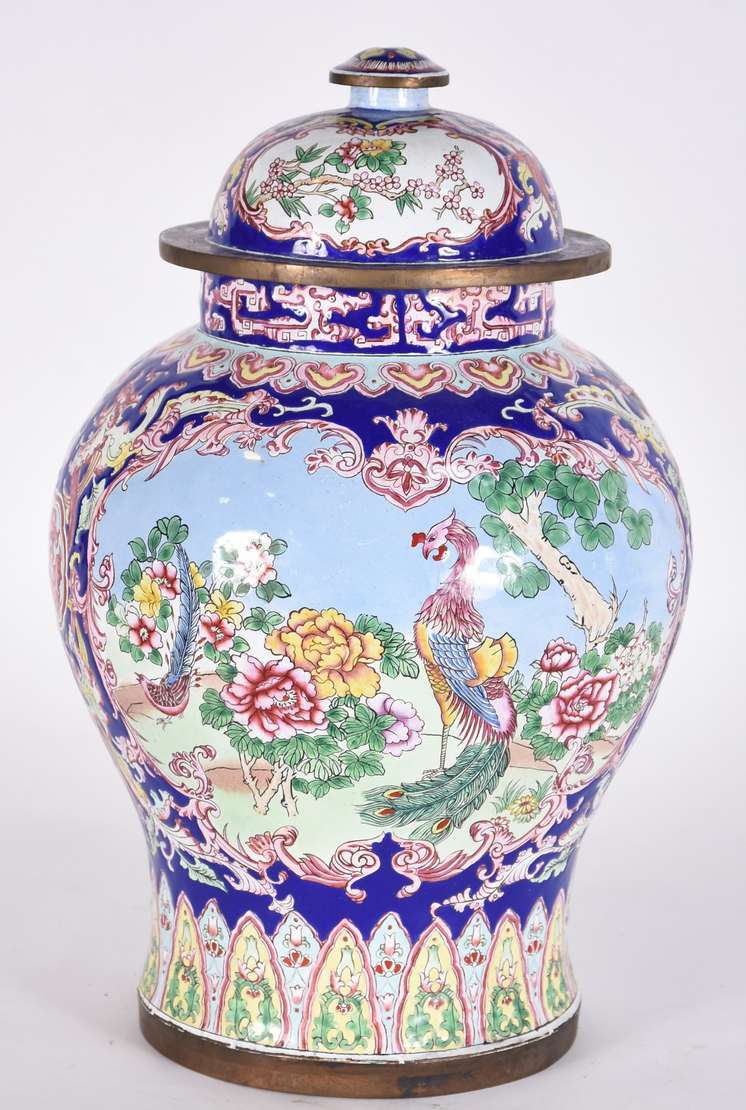 Par de potiches de formato balaústre em porcelana chinesa, decorados em azul cobalto com flores e folhagens em arabes...