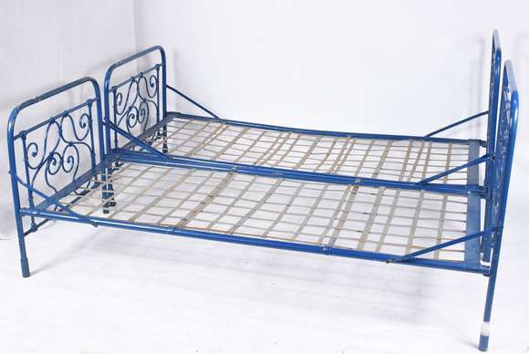 Par de antigas camas de solteiro de metal pintadas de azul.