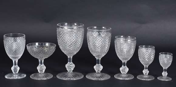 Serviço de copos de vidro bico de jaca composto de: 9 para água, 8 vinho tinto, 10 vinho branco, 9 para licor, 8 para...