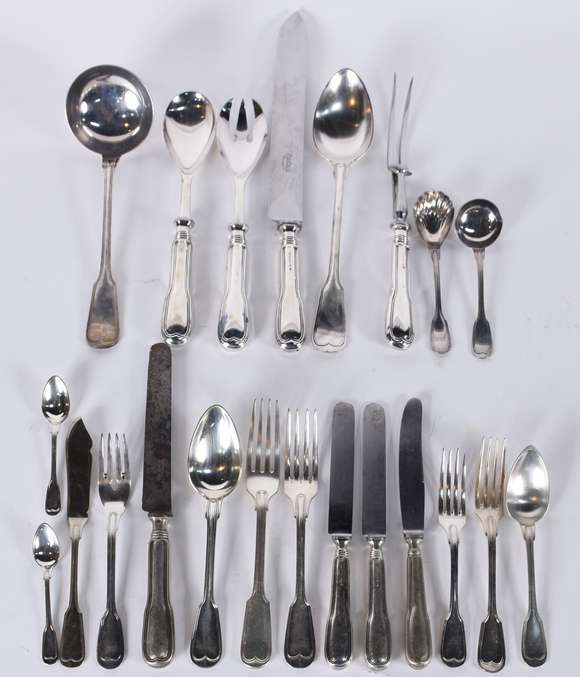 Faqueiro de prata composto: 12 colheres, 12 garfos, 12 facas grandes; 12 colheres, 12 garfos, 12 facas de sobremesa; ...
