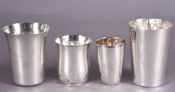 Quatro copos diversos de prata de lei. Peso da prata: 280 g (Por motivos de segurança a peça não se encontra na loja)