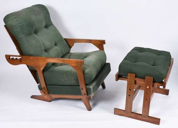 Poltrona de madeira nobre, encosto reclinável, estofamento forrado com tecido na cor verde, acompanha banqueta. (teci...