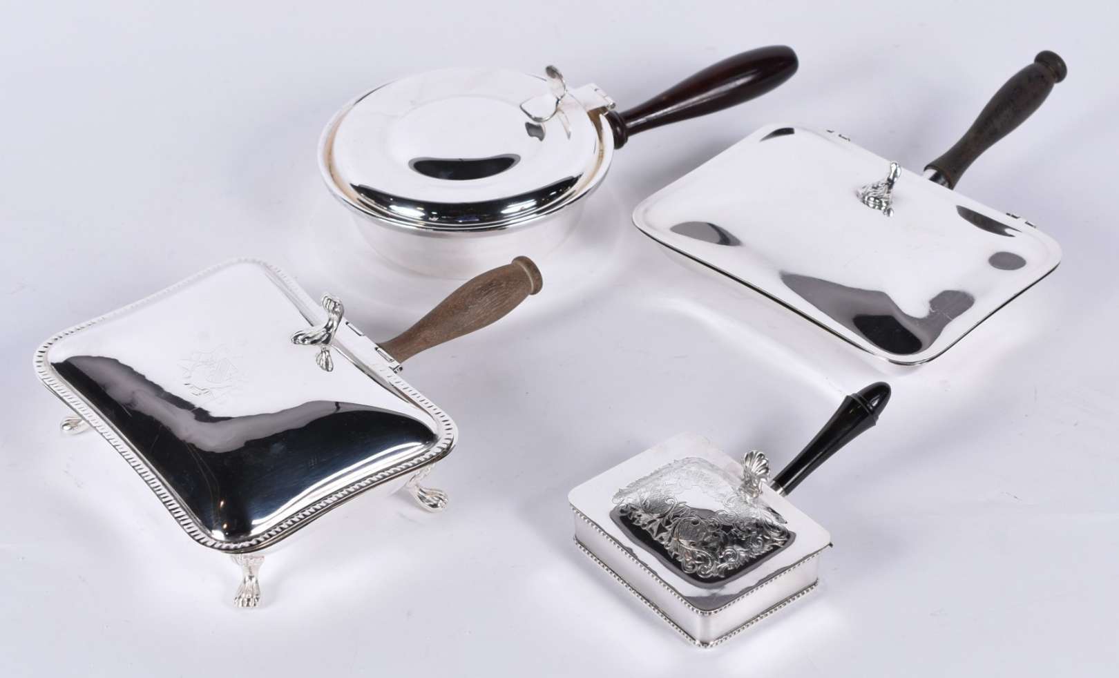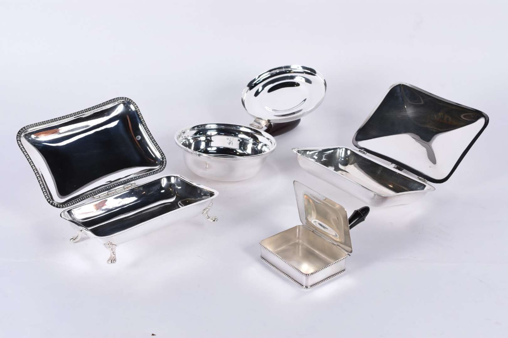 Quatro caixas de prata , sendo: porta fosforo, caixa em gomos (amassada) e 2 cigarreias com interior de madeira (uma ...