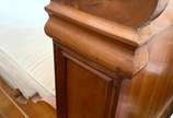 Baú de madeira nobre com "almofadas" feitio losangos, ferragens aparentes e pés arredondados.
