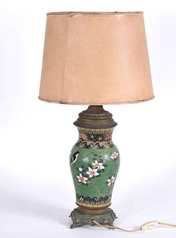 Abatjour de antigo cloisonné na cor verde com pássaro e flores em policromia, guarnição de metal, cúpula bege.