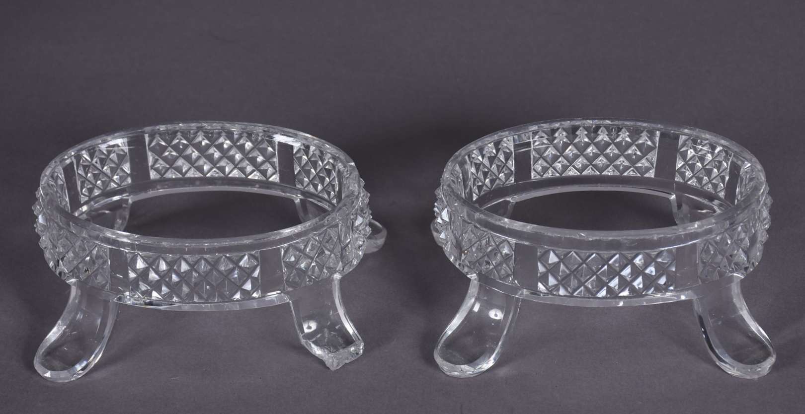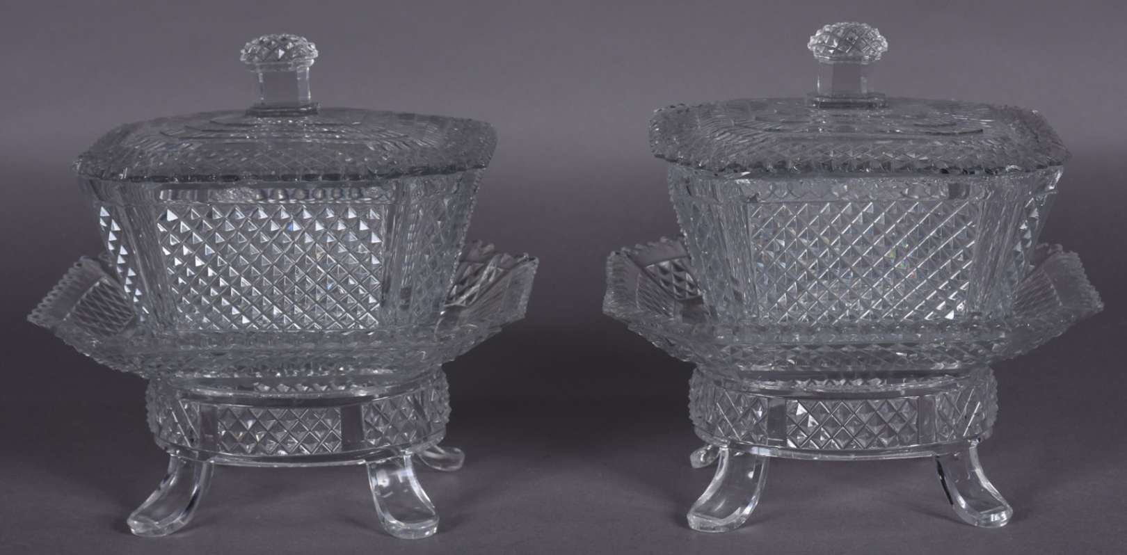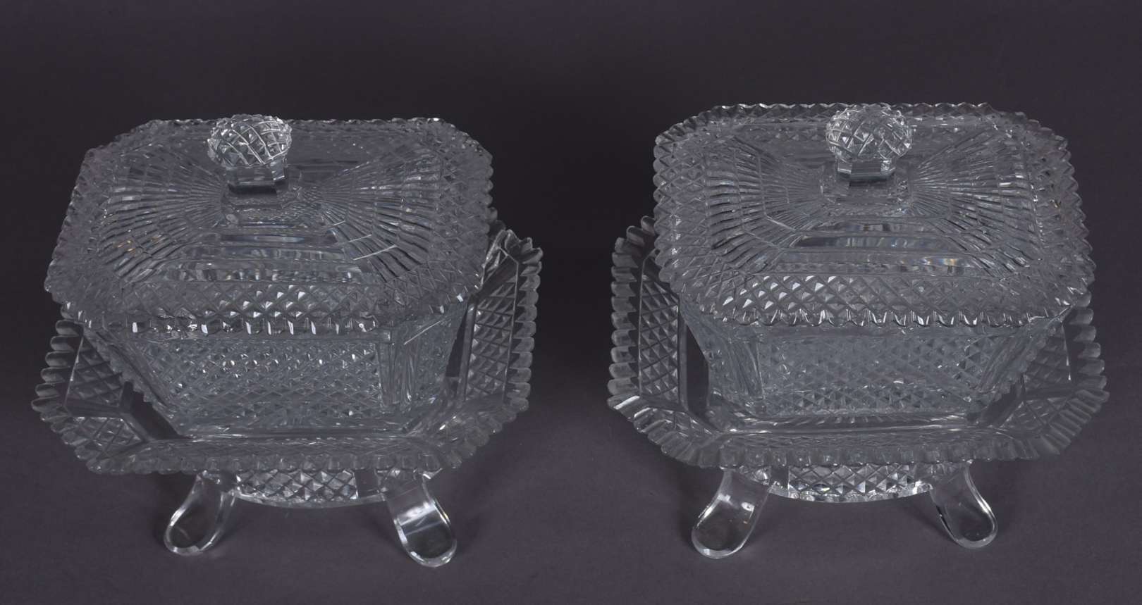 Par de bombonieres de cristal lapidado, feitio quadrangulares, acompanham presentoires. Bases separadas no feitio oval com quatro pés recurvos cada. (uma delas com corpo e presentoir rachados e os pés lascados e a outra com lascados nas bordas).