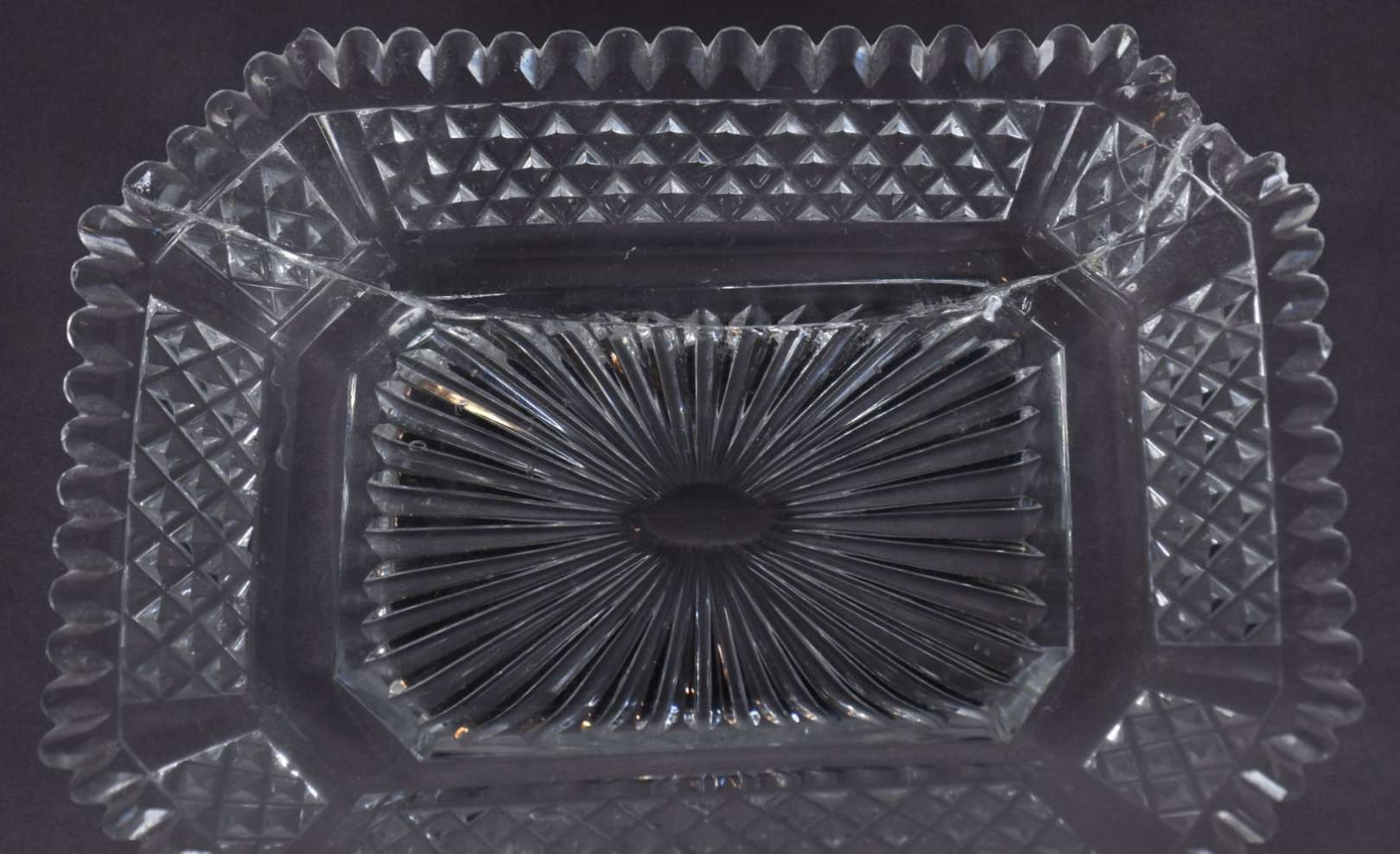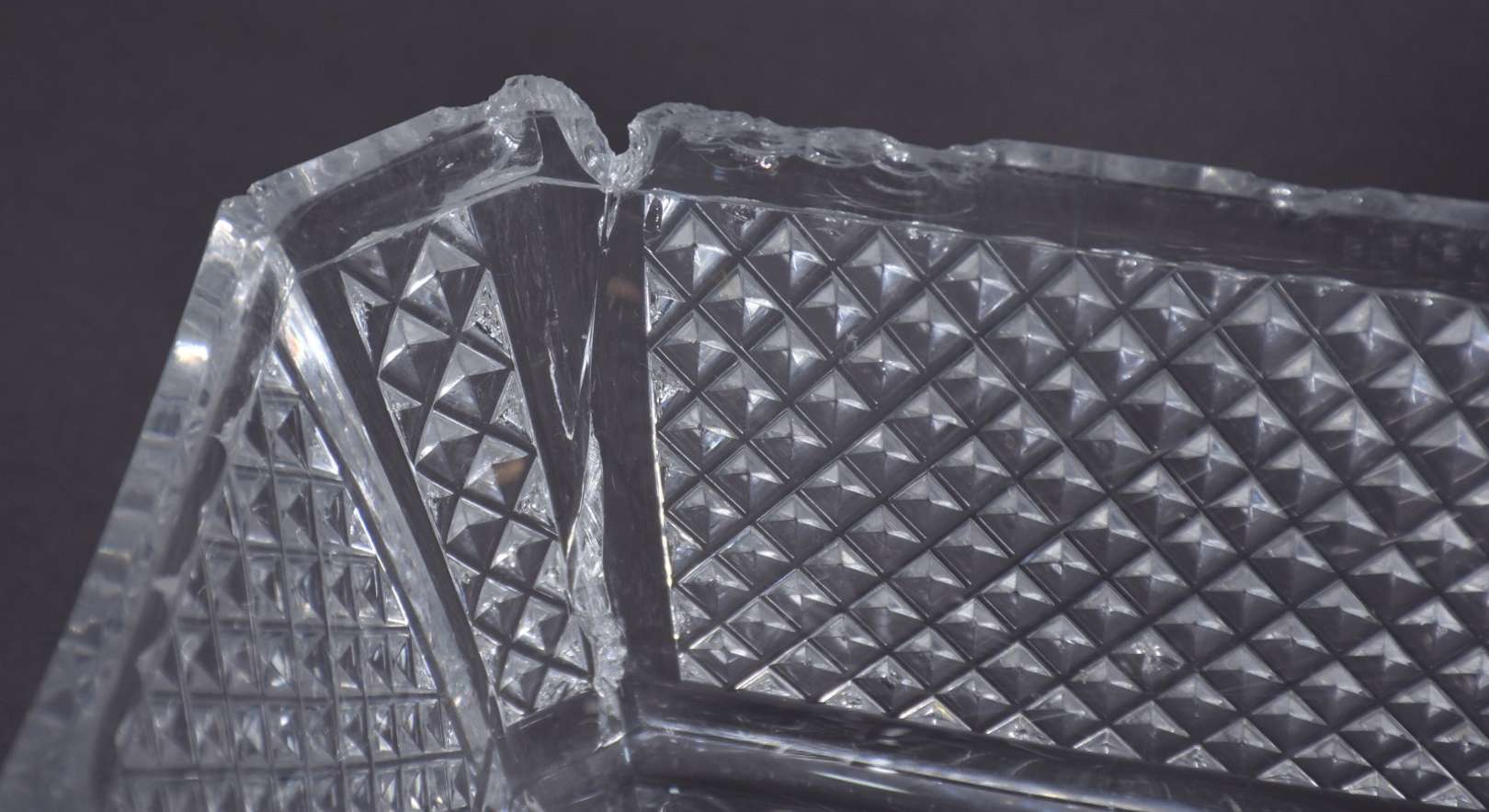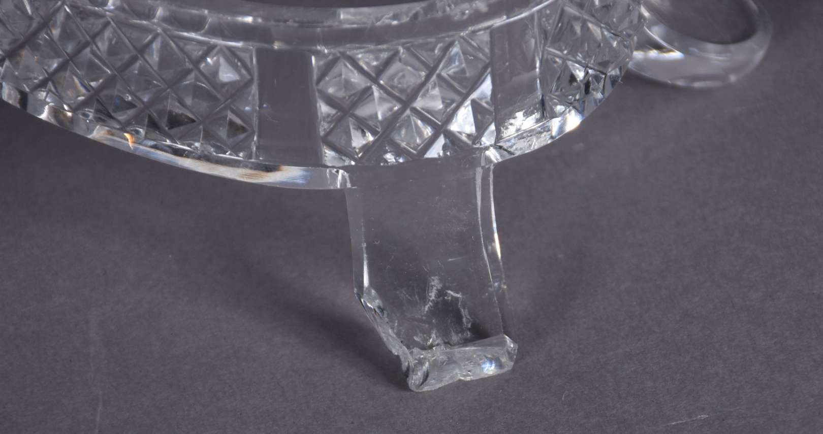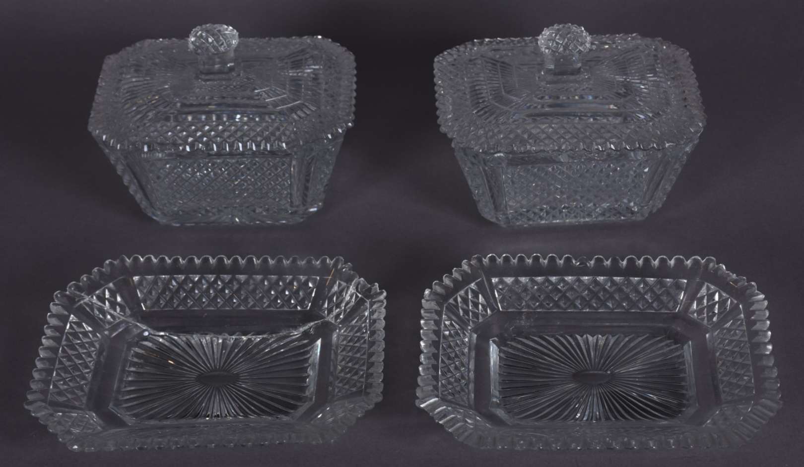 Par de bombonieres de cristal lapidado, feitio quadrangulares, acompanham presentoires. Bases separadas no feitio oval com quatro pés recurvos cada. (uma delas com corpo e presentoir rachados e os pés lascados e a outra com lascados nas bordas).
