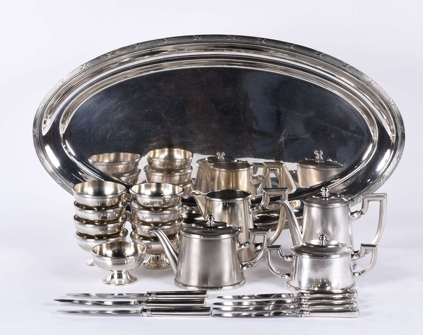 Seis pequenas peças de prata de lei, sendo: bandeja, 2 taças (uma quebrada), copo, bowl e caixa redonda. Peso da prat...