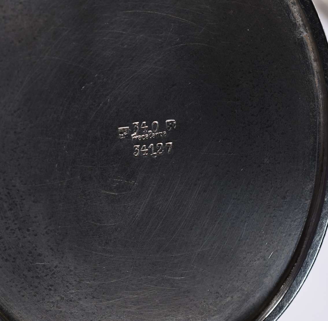 Cinco pequenas peças de prata de lei, sendo: cinzeiro, porta fósforos, lamparina(sem tampa), provador de vinho e par ...