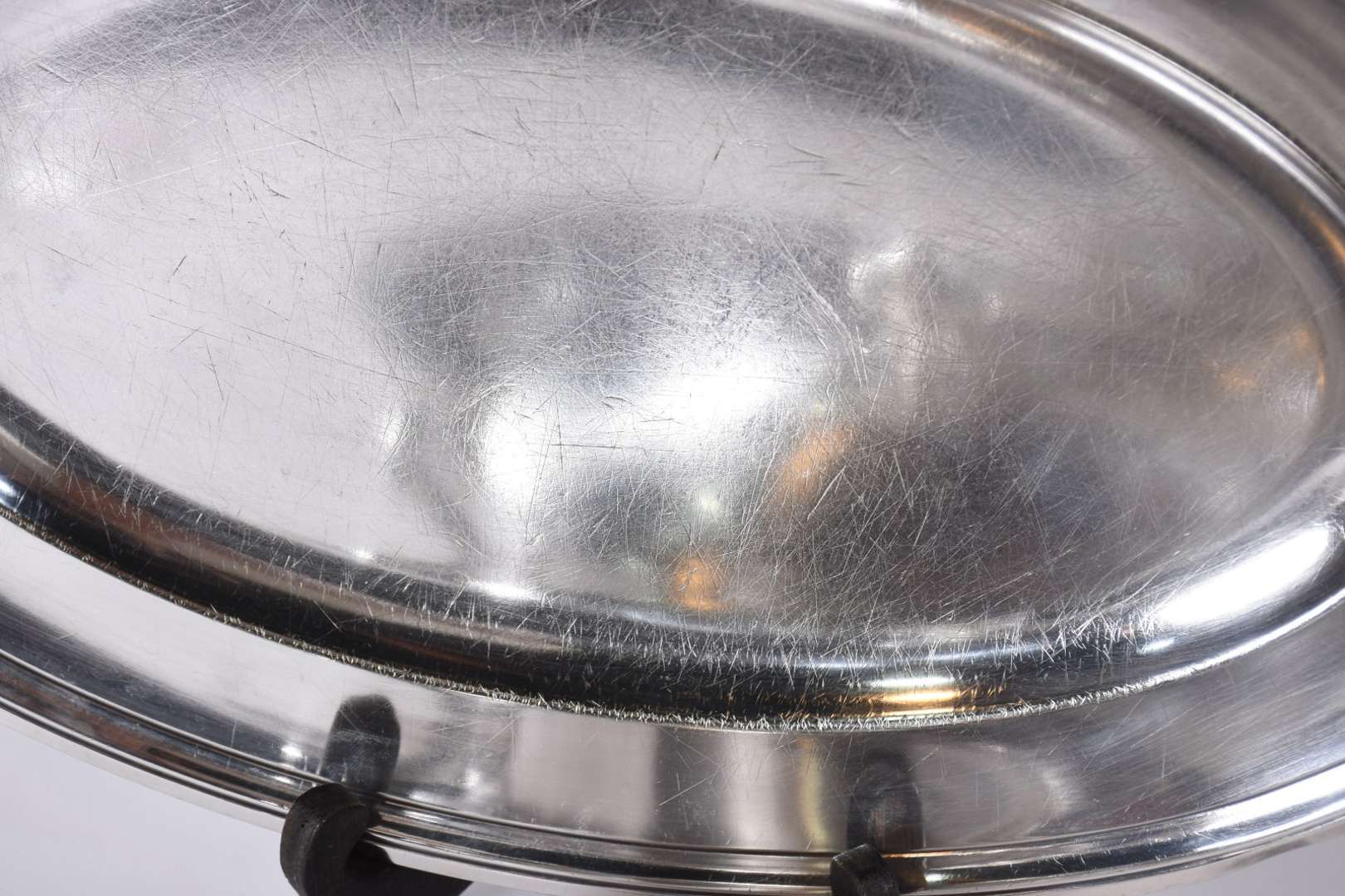 Par de grandes rechauds de metal prateado, desgastes e um deles faltando parafusos do suporte.