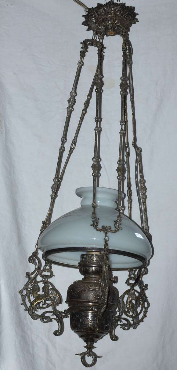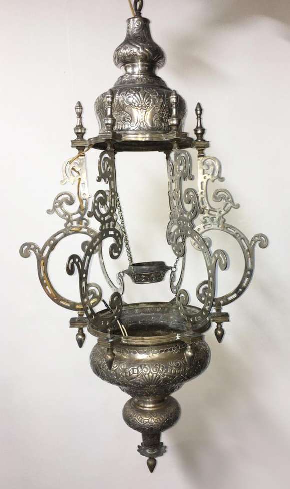Imponente lampadário modelo Sabará, de prata batida, repuxada e cinzelada. Brasil, século XIX. Prateiro IM. Medido: ...