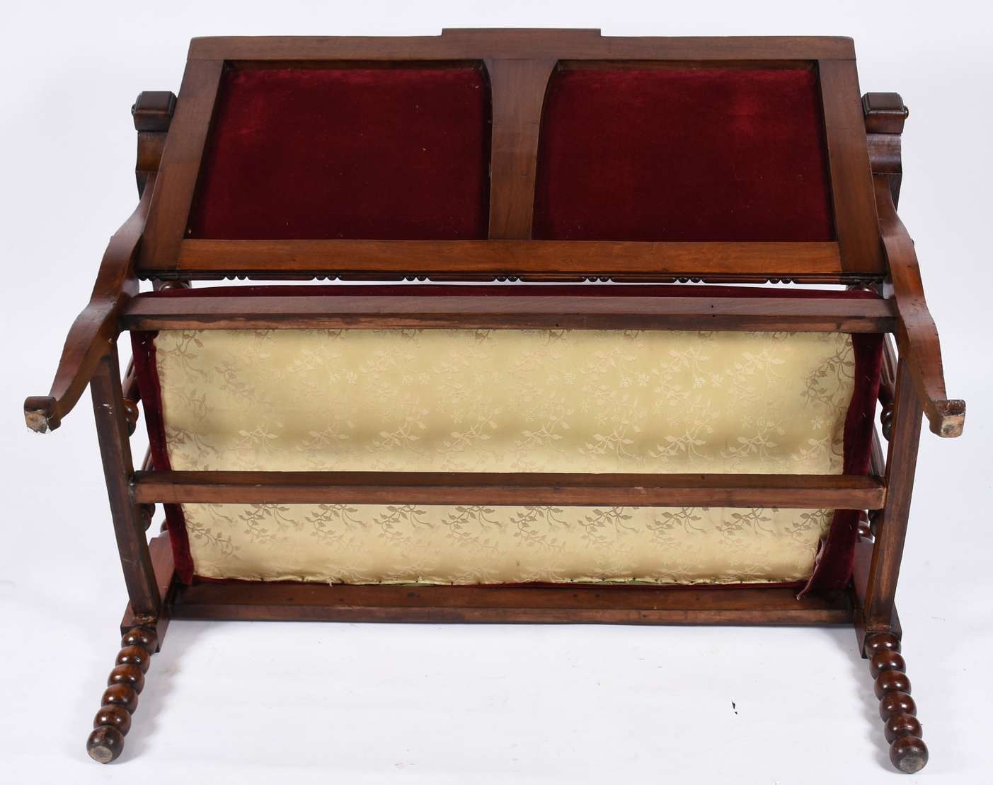 Cadeira de balanço de madeira nobre, braços com traves torneadas, estofamento floral.