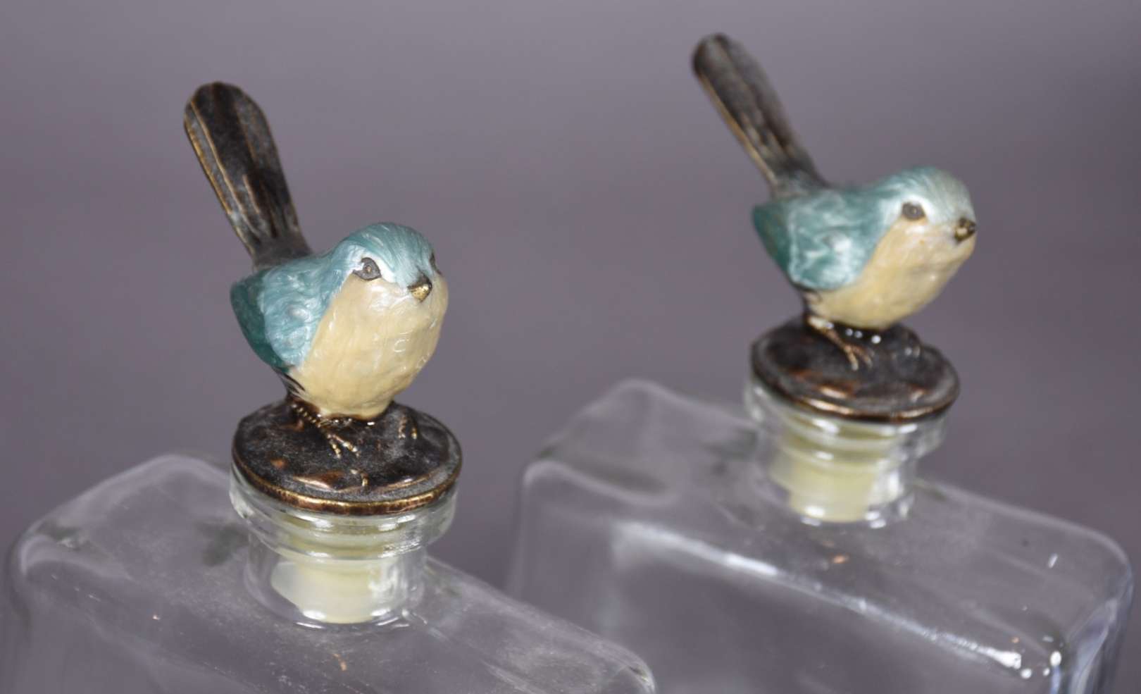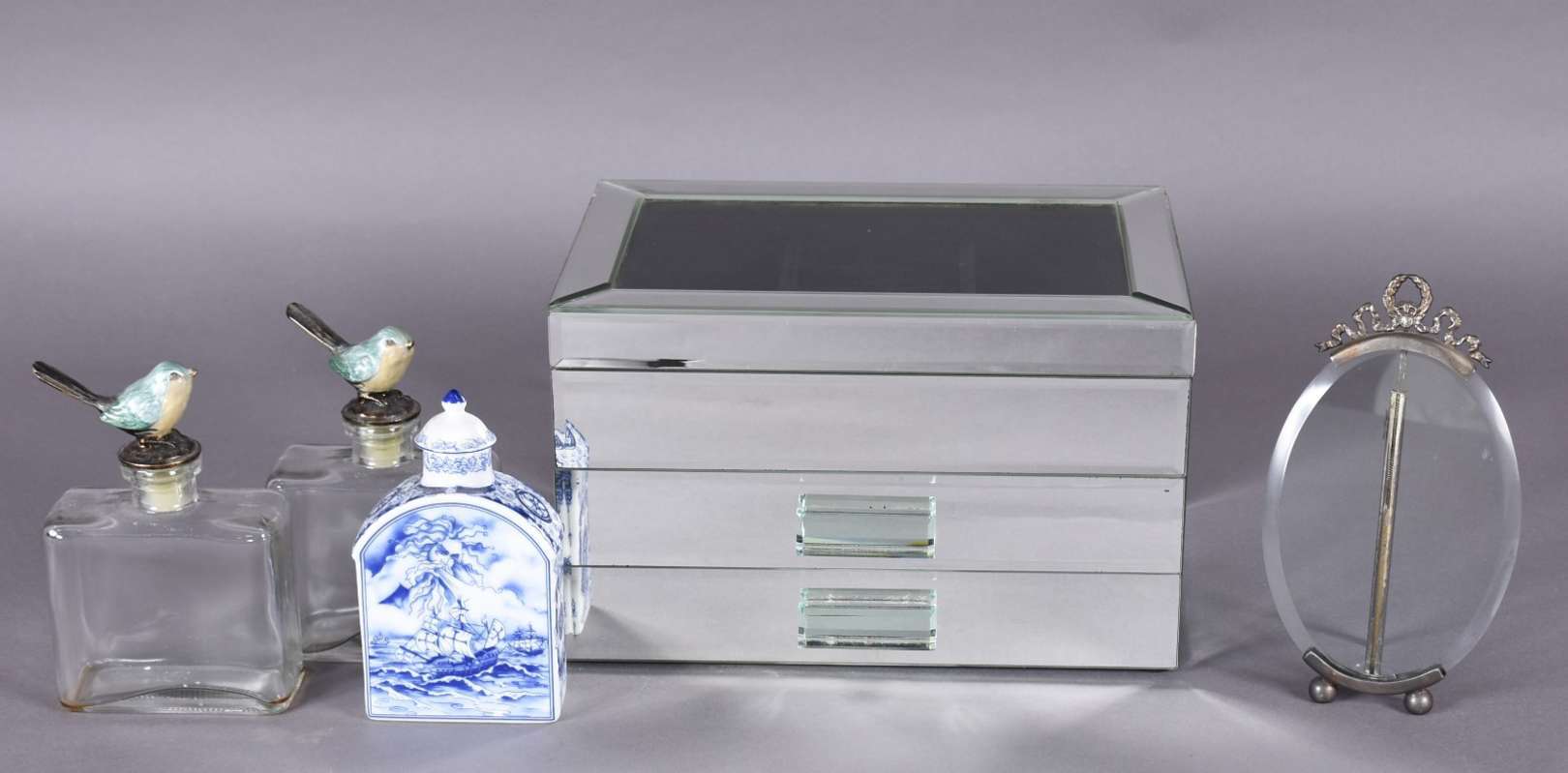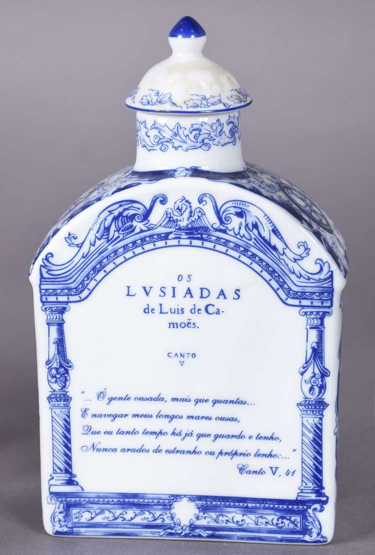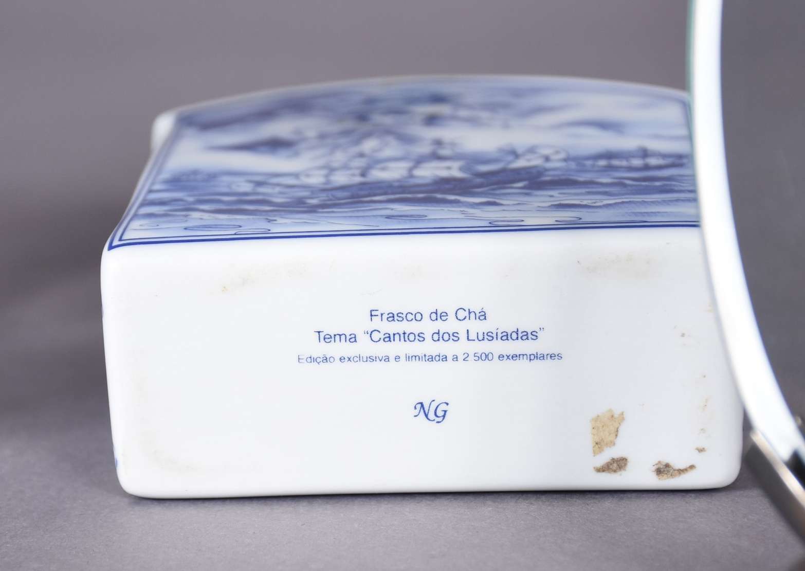 Três peças de porcelana francesa na cor azul cobalto com cenas românticas e guirlandas em dourado.