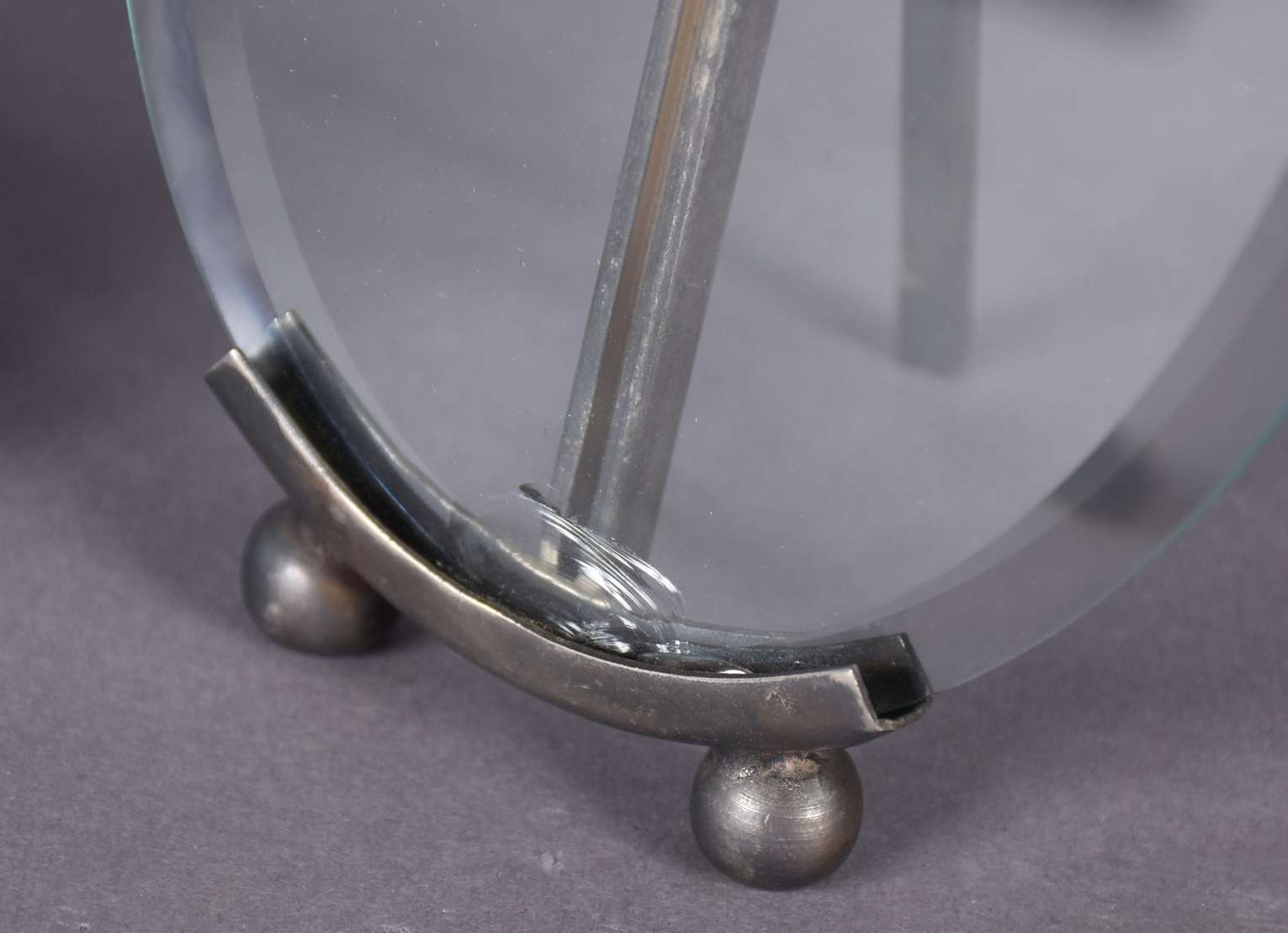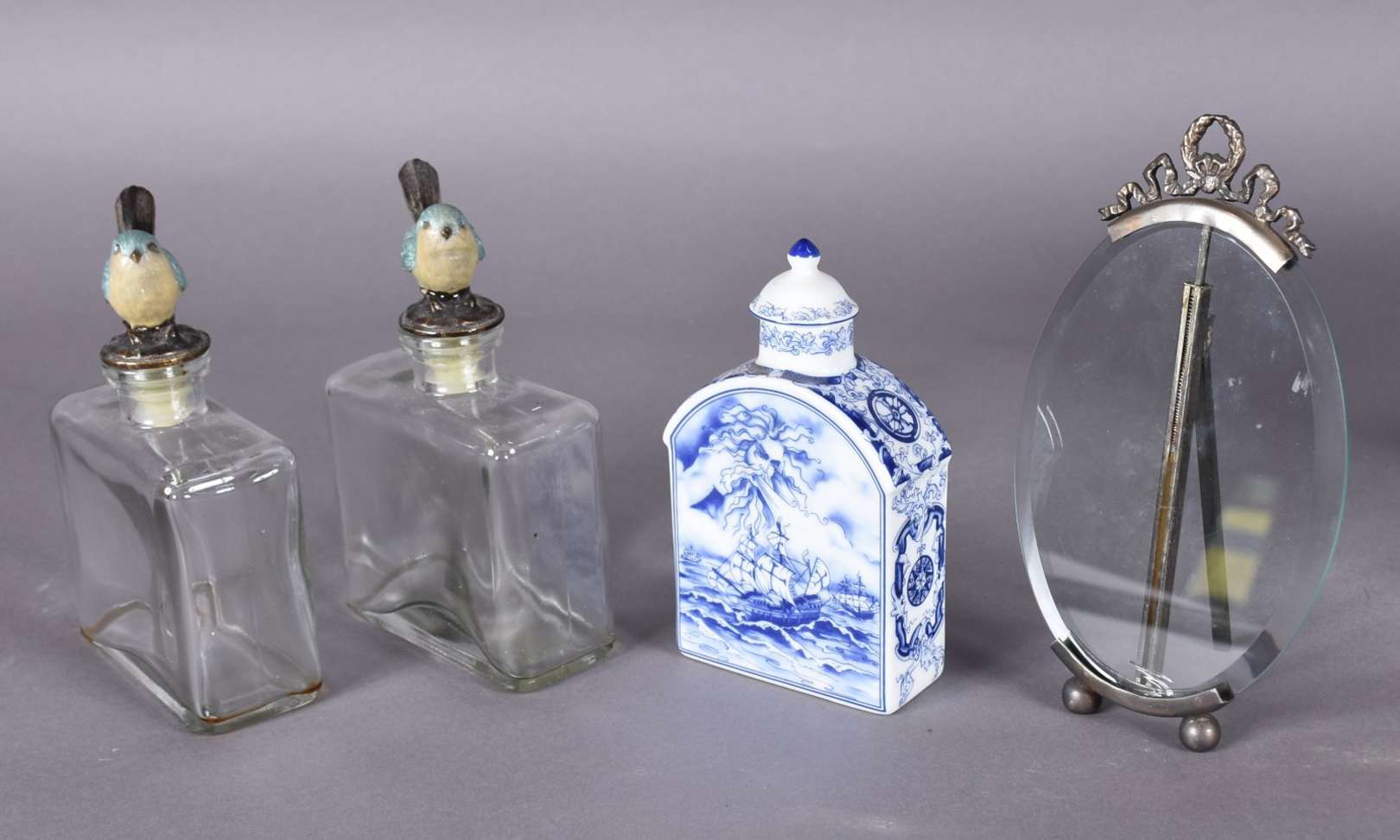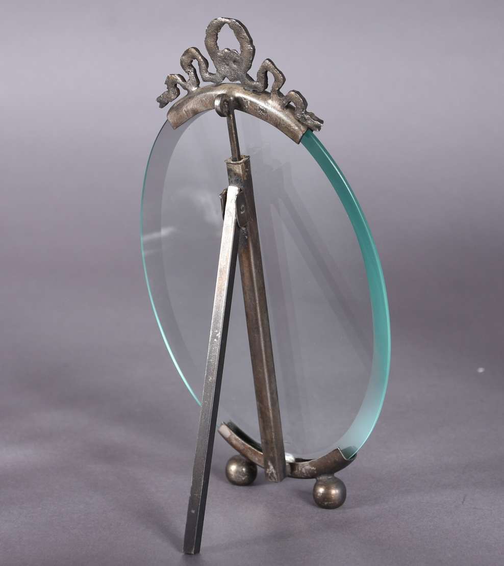 Quatro peças de metal prateado, sendo fruteira com base na forma de figura feminina (prato está solto), medalhão com...