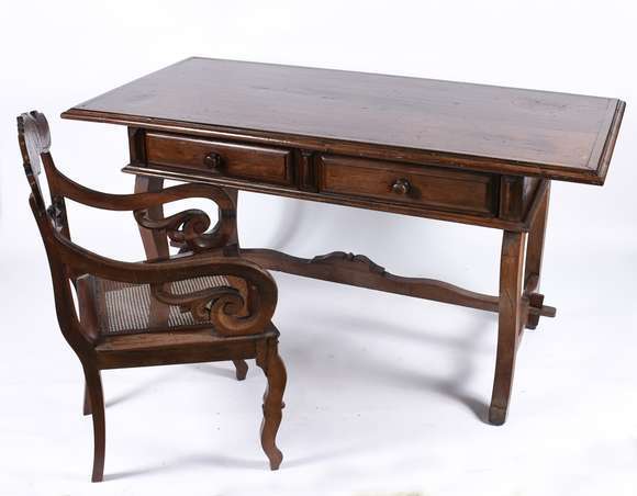 Antiga e imponente mesa de escritório de madeira nobre com 2 gavetas, pernas arqueadas na forma de lira ligadas por t...