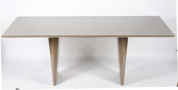 Mesa de jantar com base laqueada e tampo com vidro superposto na cor acinzentada (pequenas partes com a tinta descasc...