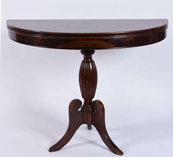 Mesa de jacarandá feitio meia lua, tampo dobrável ficando no formato redondo, base em coluna balaústre gomada termina...