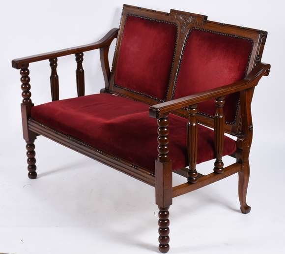 Pequeno sofá para dois lugares de madeira nobre torneada, assento e encosto estofado e forrado com tecido vermelho (a...