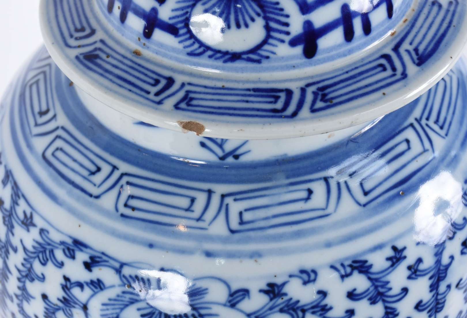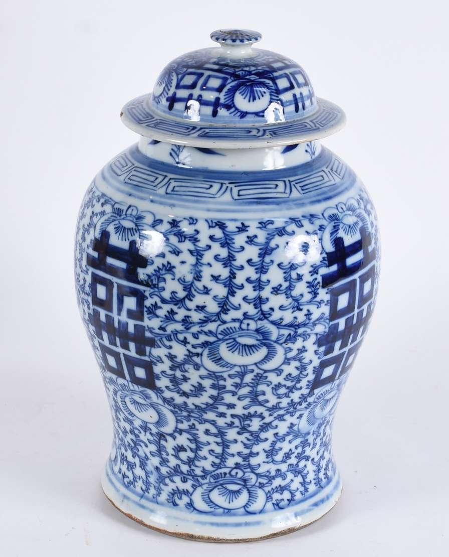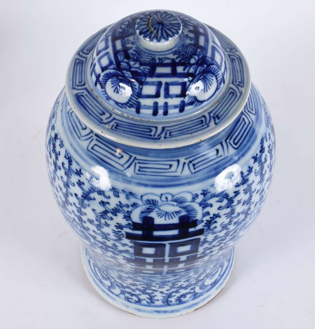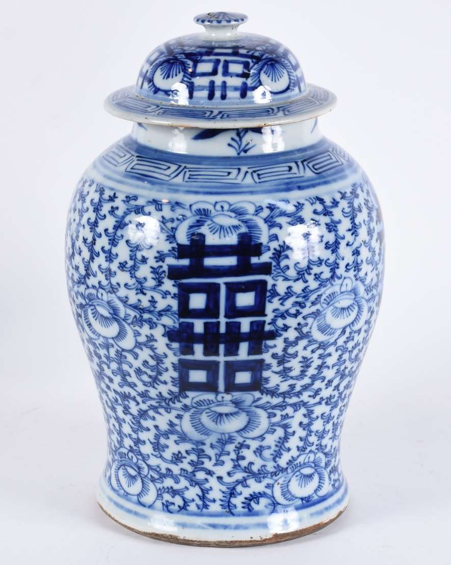 Potiche antigo de porcelana chinesa azul e branca, decorado com ideogramas da dupla felicidade, símbolo da fidelidade conjugal, sobre fundo com guirlandas florais, pequenos bicados na tampa. Meados do século XIX.