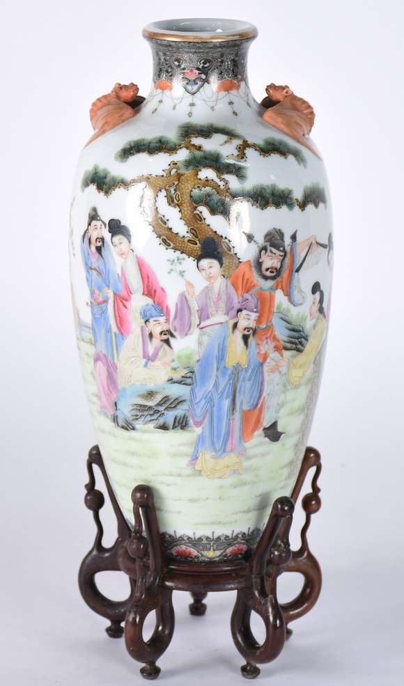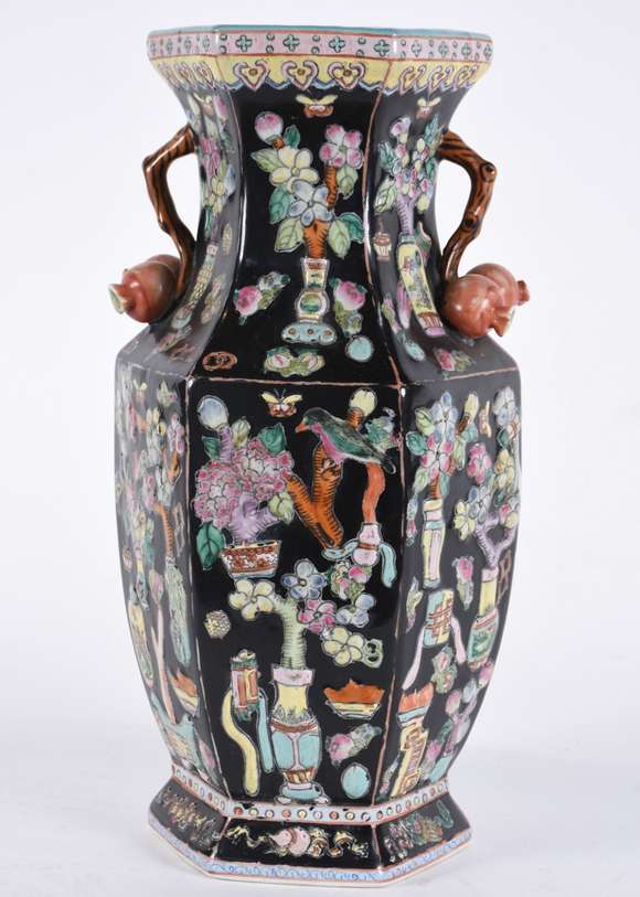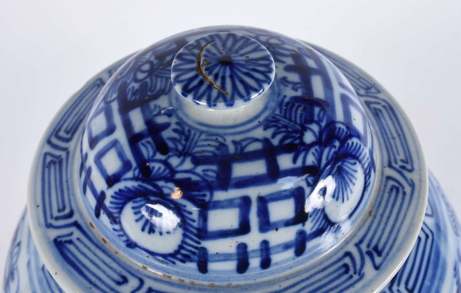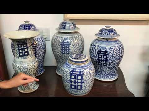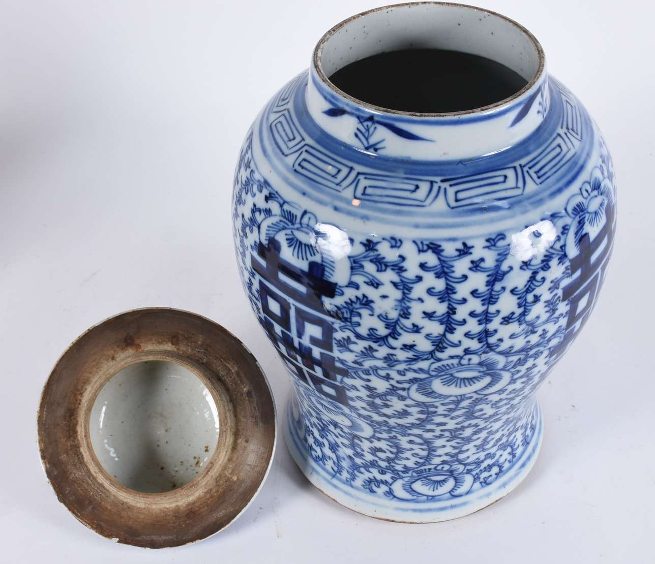 Potiche antigo de porcelana chinesa azul e branca, decorado com ideogramas da dupla felicidade, símbolo da fidelidade conjugal, sobre fundo com guirlandas florais, pequenos bicados na tampa. Meados do século XIX.