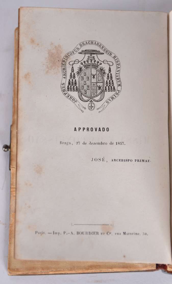 Antigo cofre de templo chinês de madeira, detalhes em metal, selo vermelho na base.
