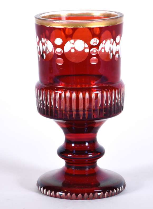 Antigo copo/goblet de cristal doublé rubi lapidado, borda com friso dourado.