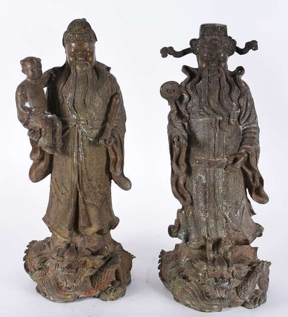 Par de antigos imperadores chineses sobre dragões em bronze ricamente trabalhados. Ex-coleção família Matarazzo.