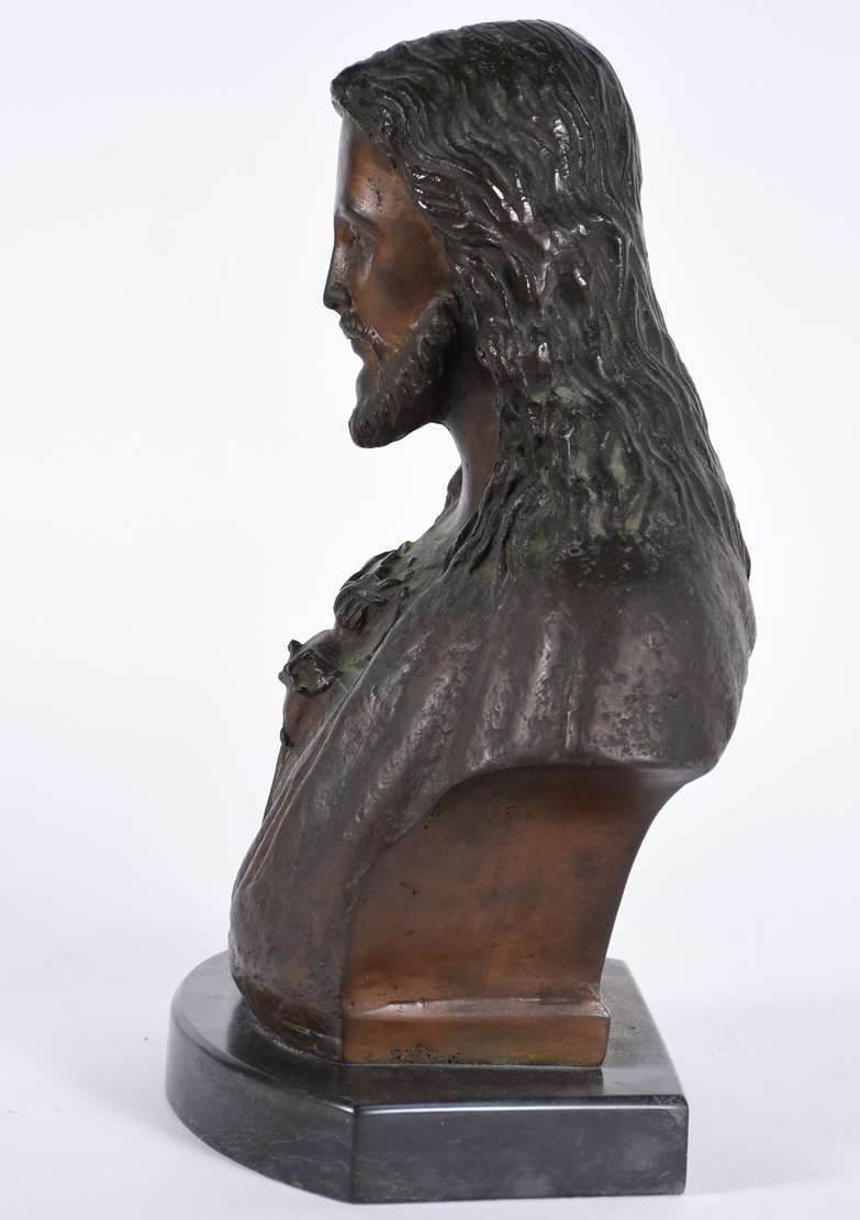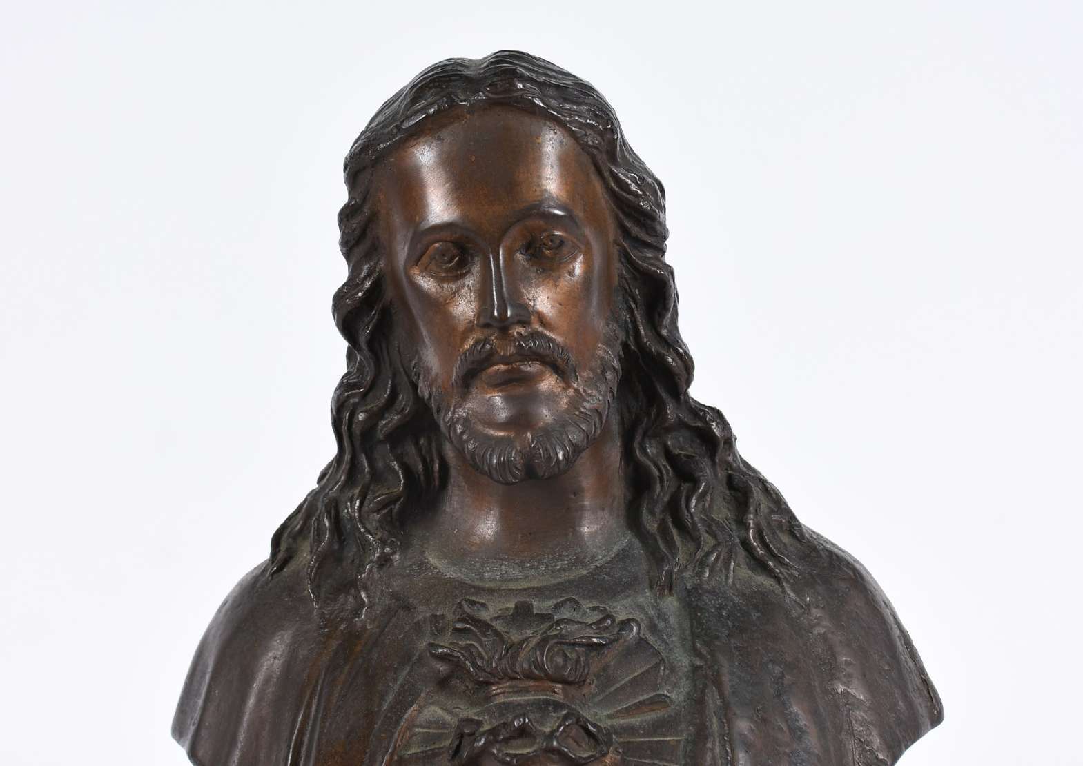 Escultura de bronze representando Sagrado Coração de Jesus.