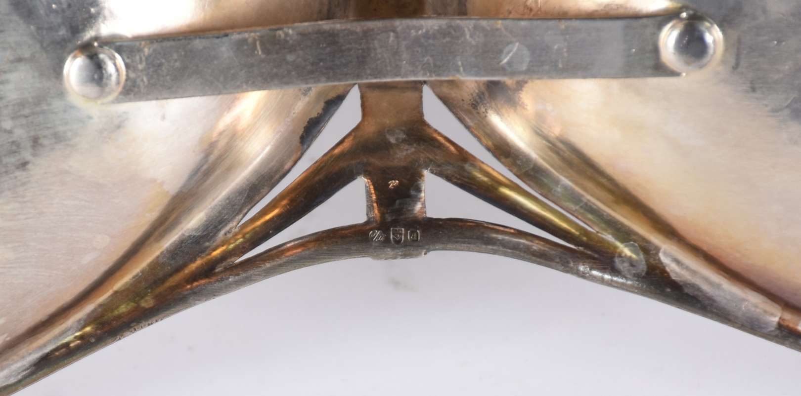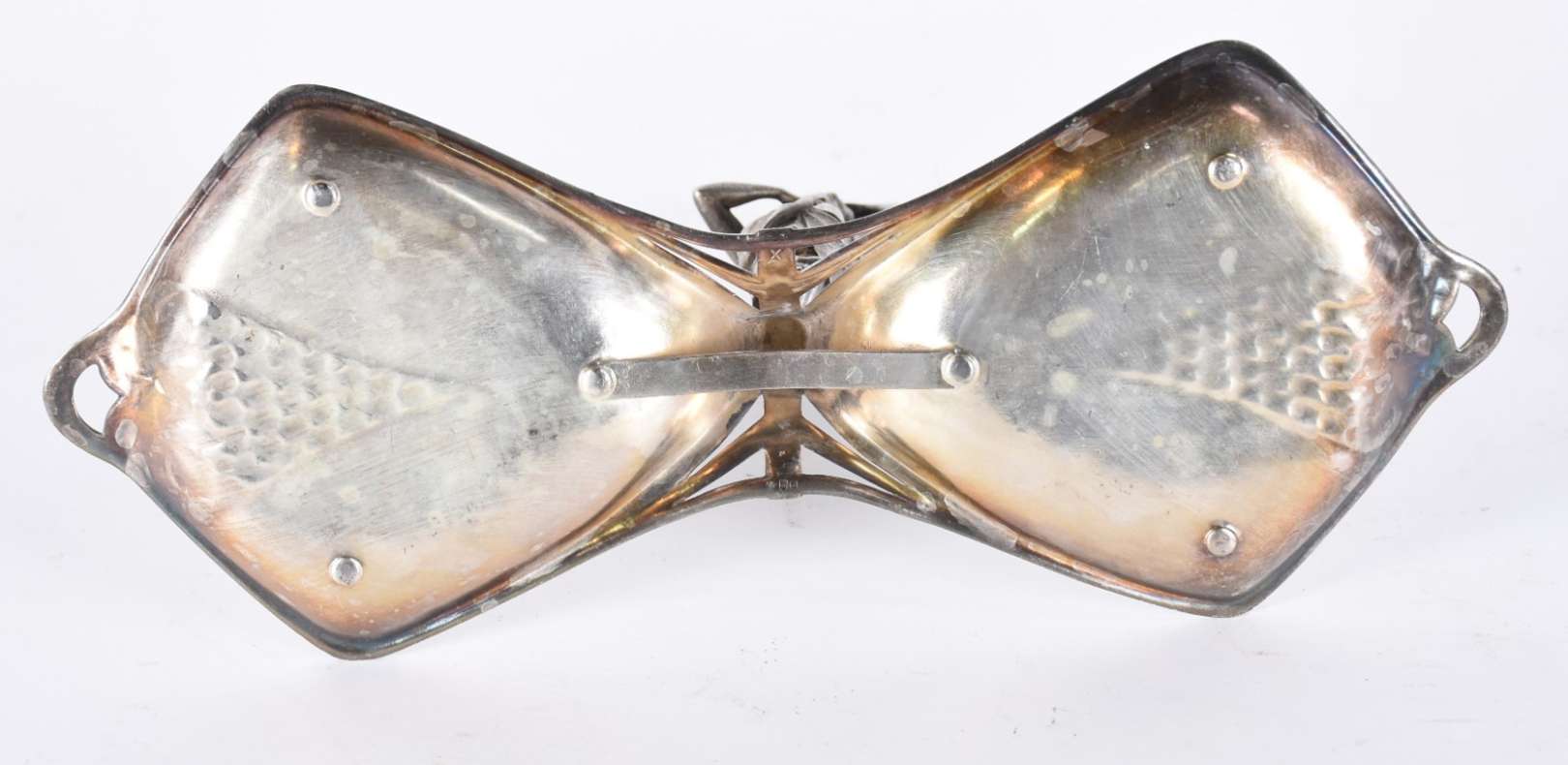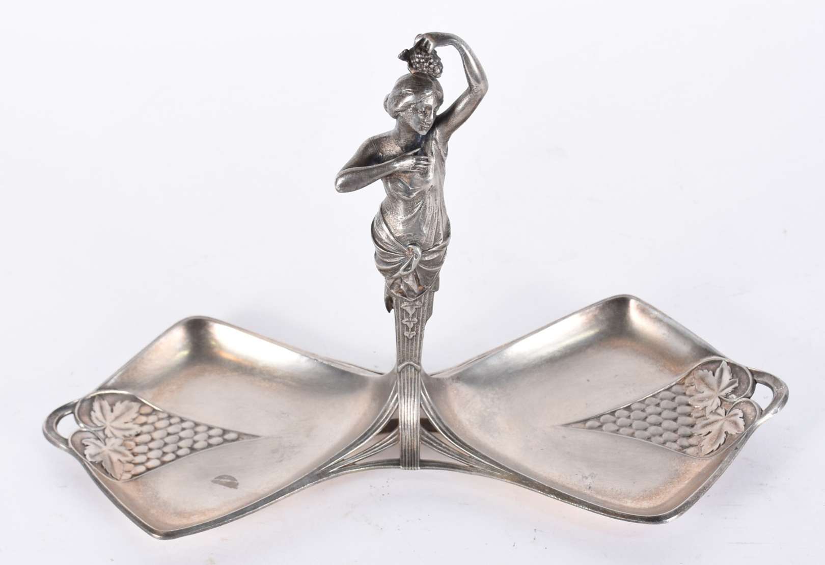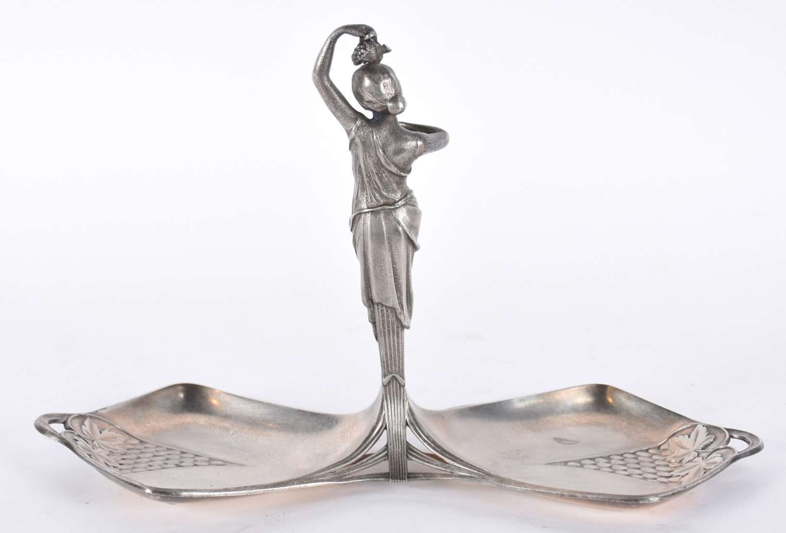 Centro de mesa Art Nouveau de metal prateado possivelmente WMF, decorado com flores e guirlandas em relevo, recipient...