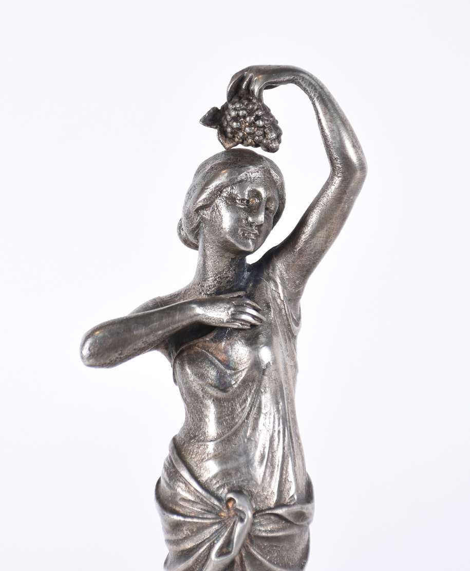 Porta cartão Art nouveau de metal representando figura feminina apoiada em grande folha sobre pedestal. Folha quebrada.