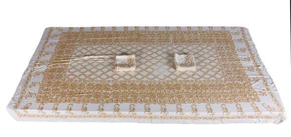 Toalha de mesa, tecido bordado com 12 guardanapos (pequeno desgaste no bordado dourado na parte central).