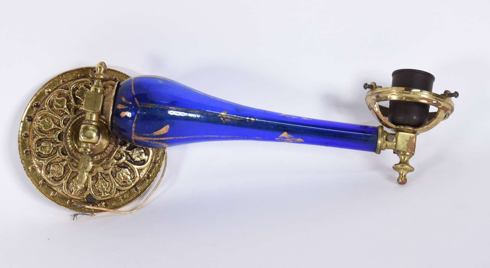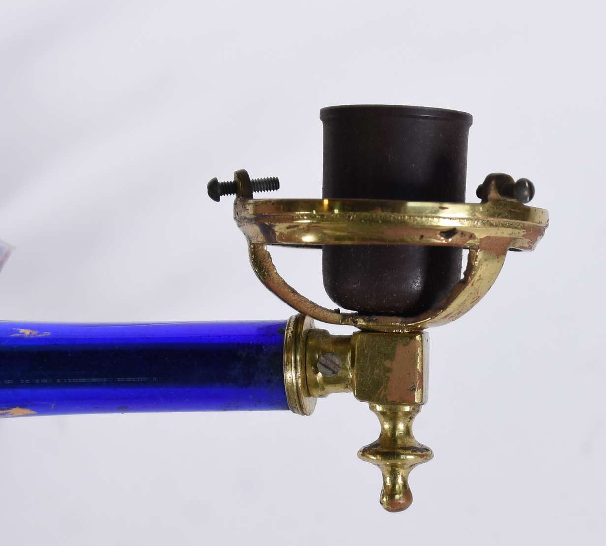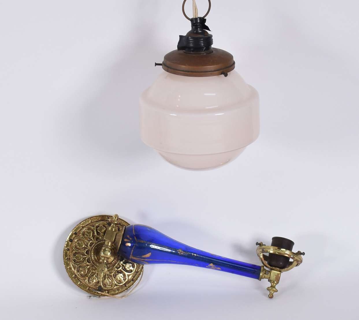 Par de abatjoures de cerâmica azul com cúpulas opalinadas.