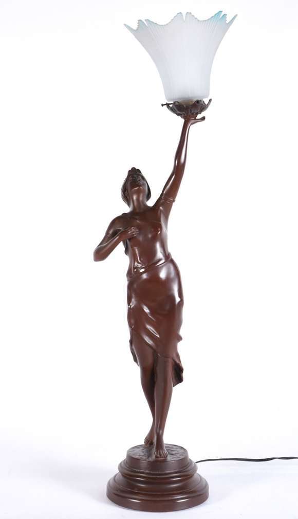 Luminária de petit bronze representando figura feminina, manga de vidro fosco.