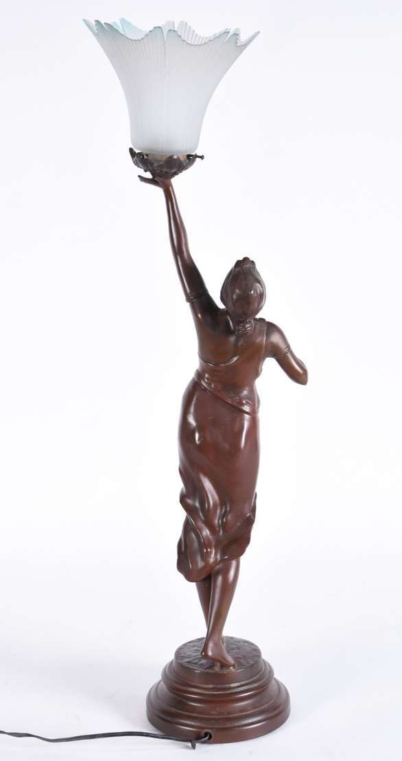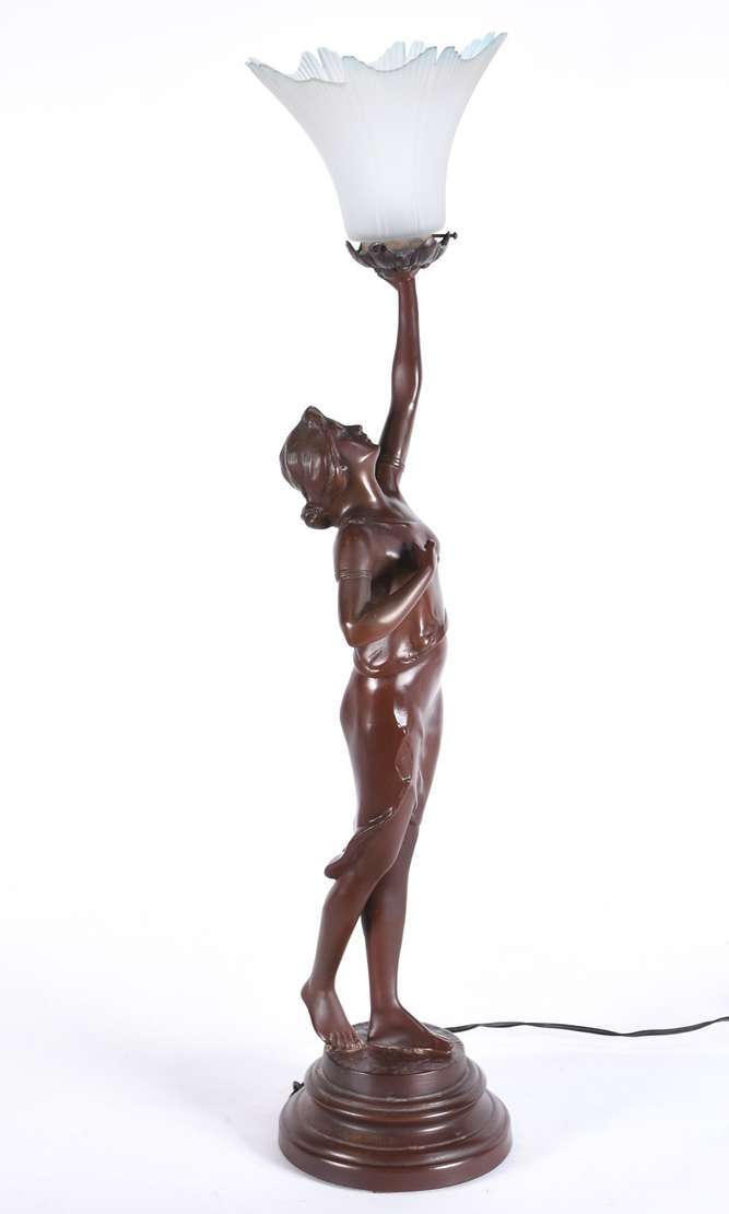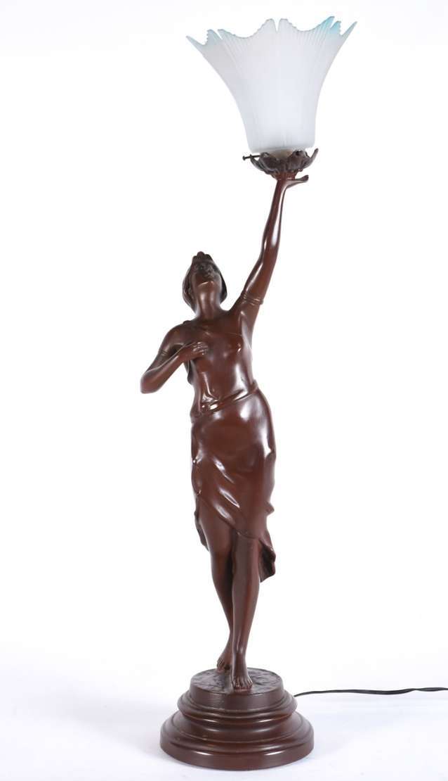 Abatjour de metal dourado com figura feminina para 6 luzes.
