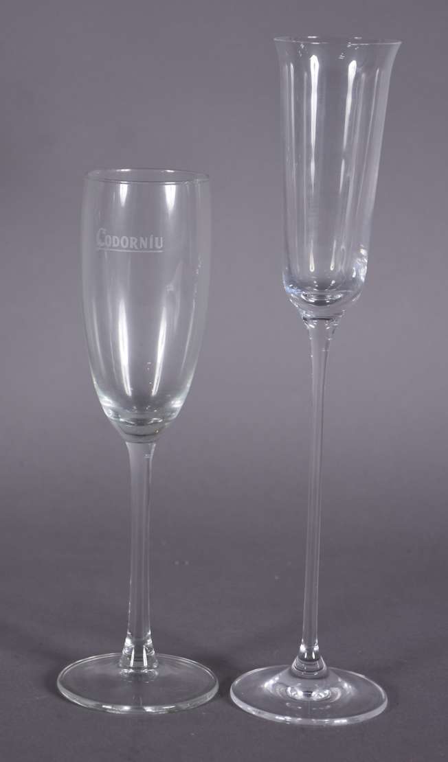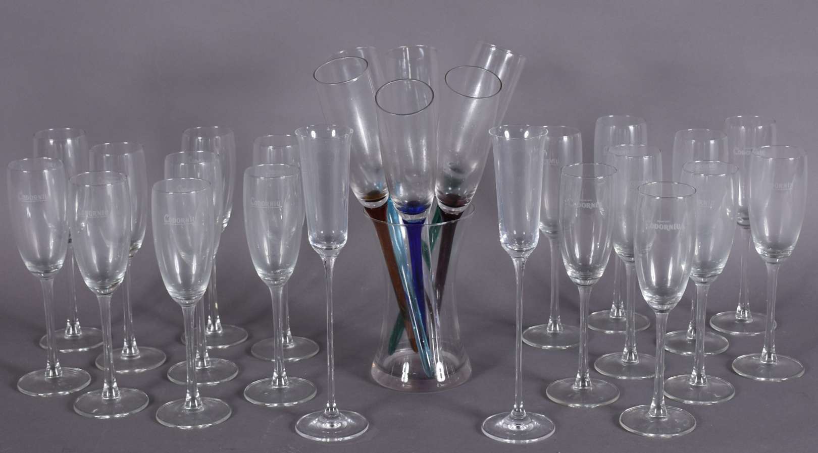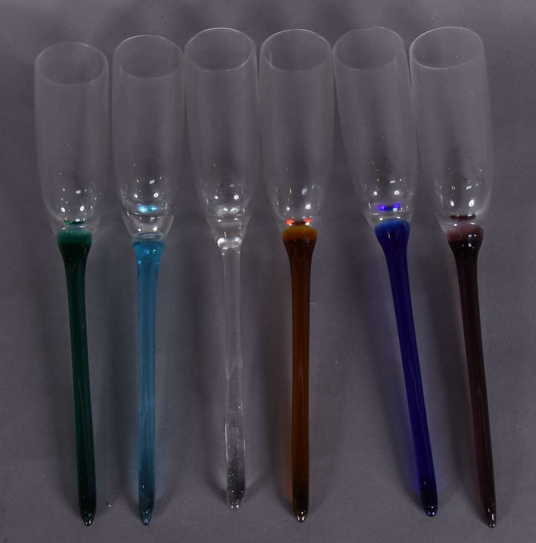 Sete peças, sendo: 6 copos de vidro colorido e garrada verde.