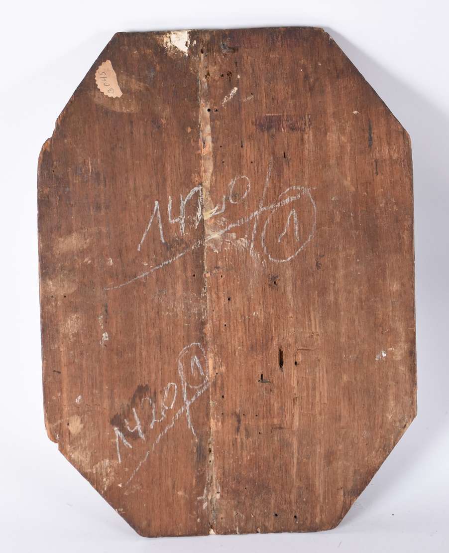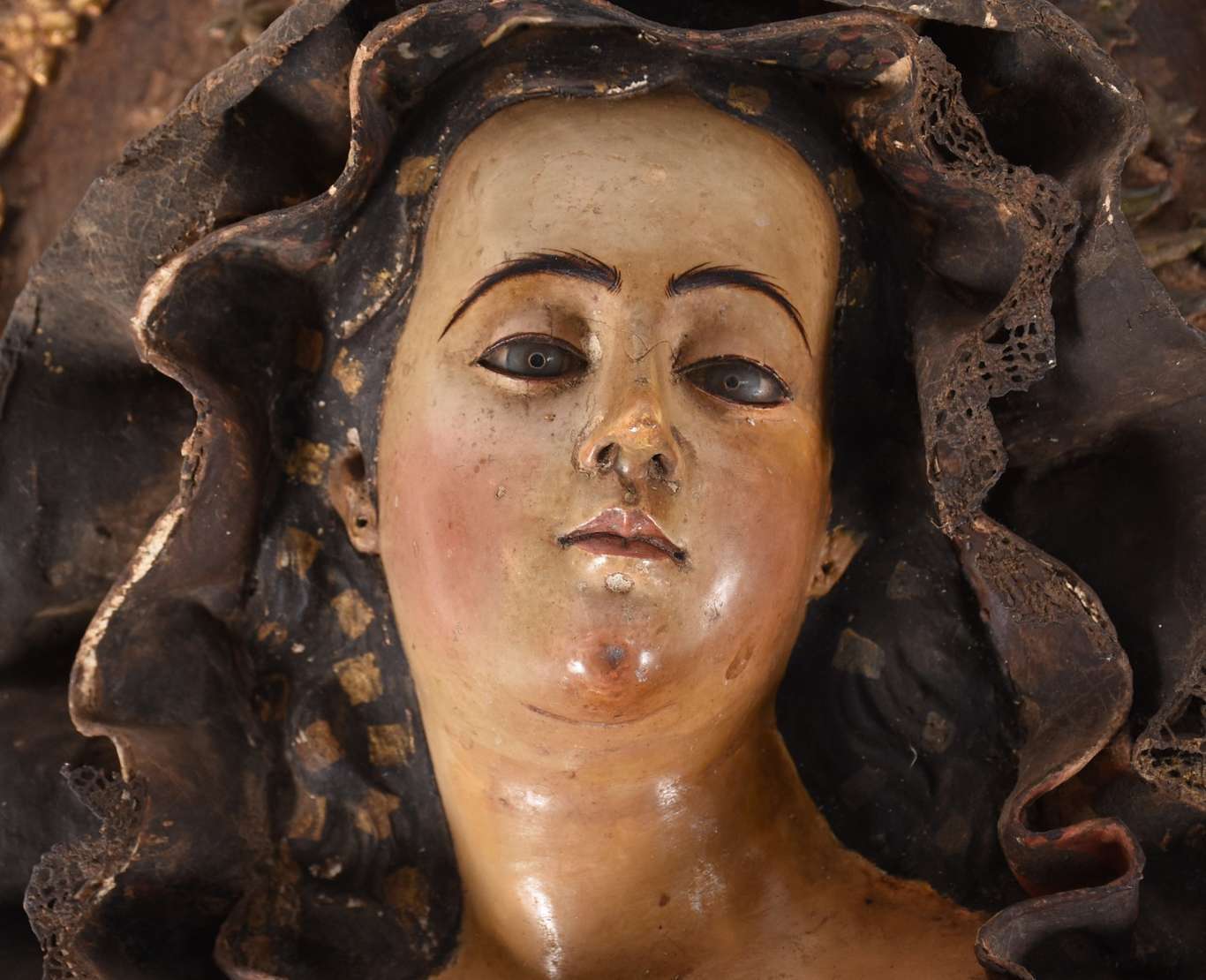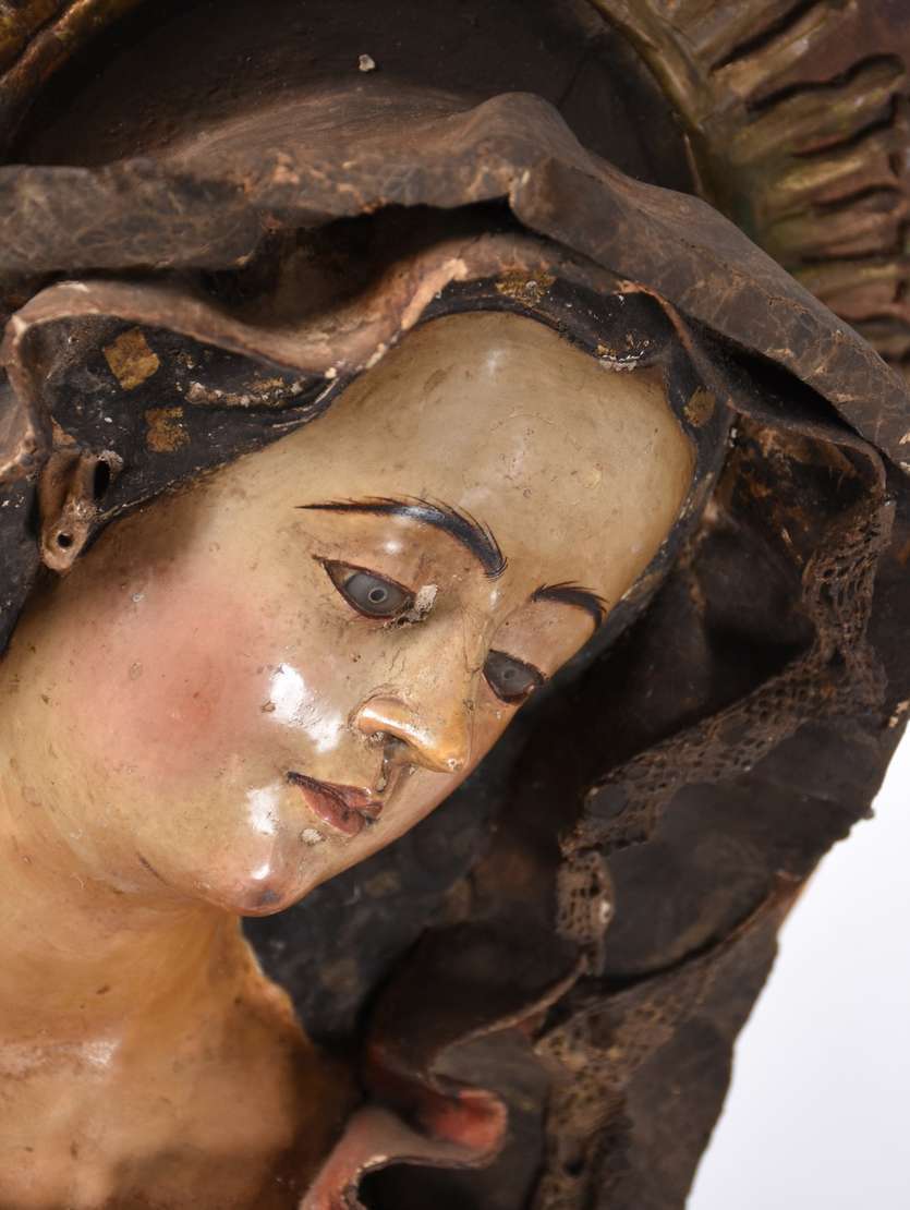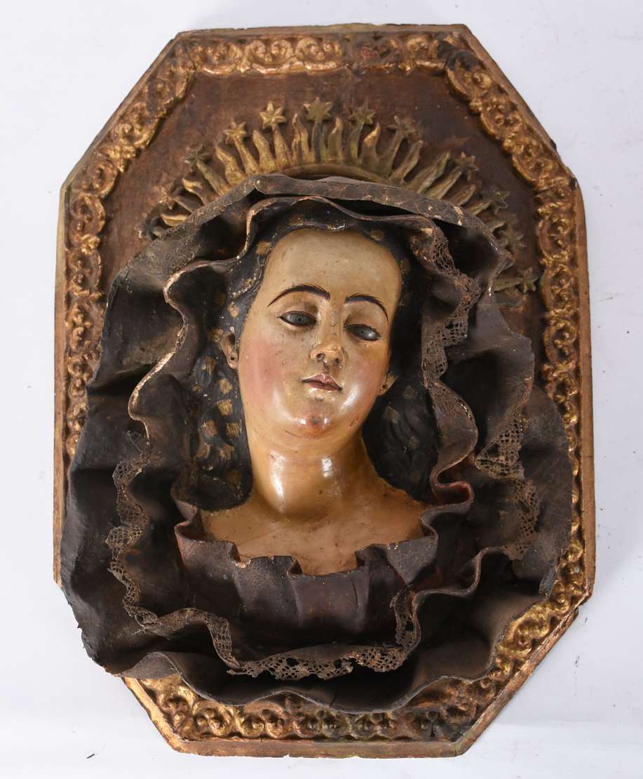 Placa antiga de madeira policromada no formato octogonal, realçado com guirlandas douradas na borda, representando busto barroco de Nossa Senhora com coroa de 24 pontas e manto em relevo.