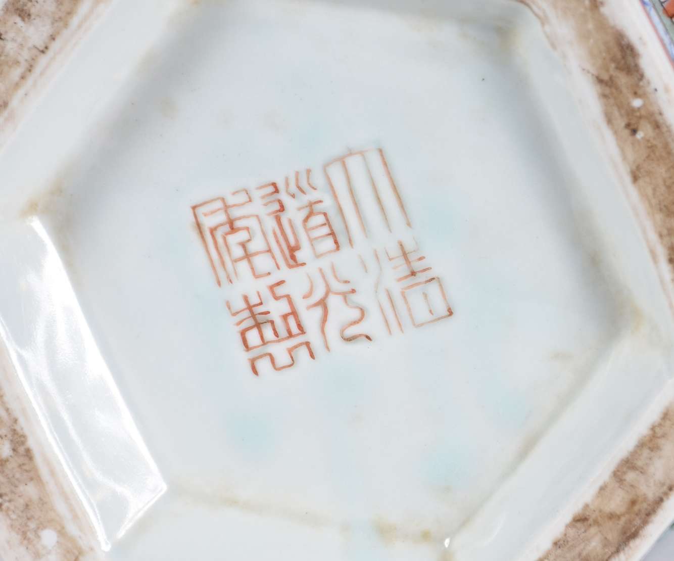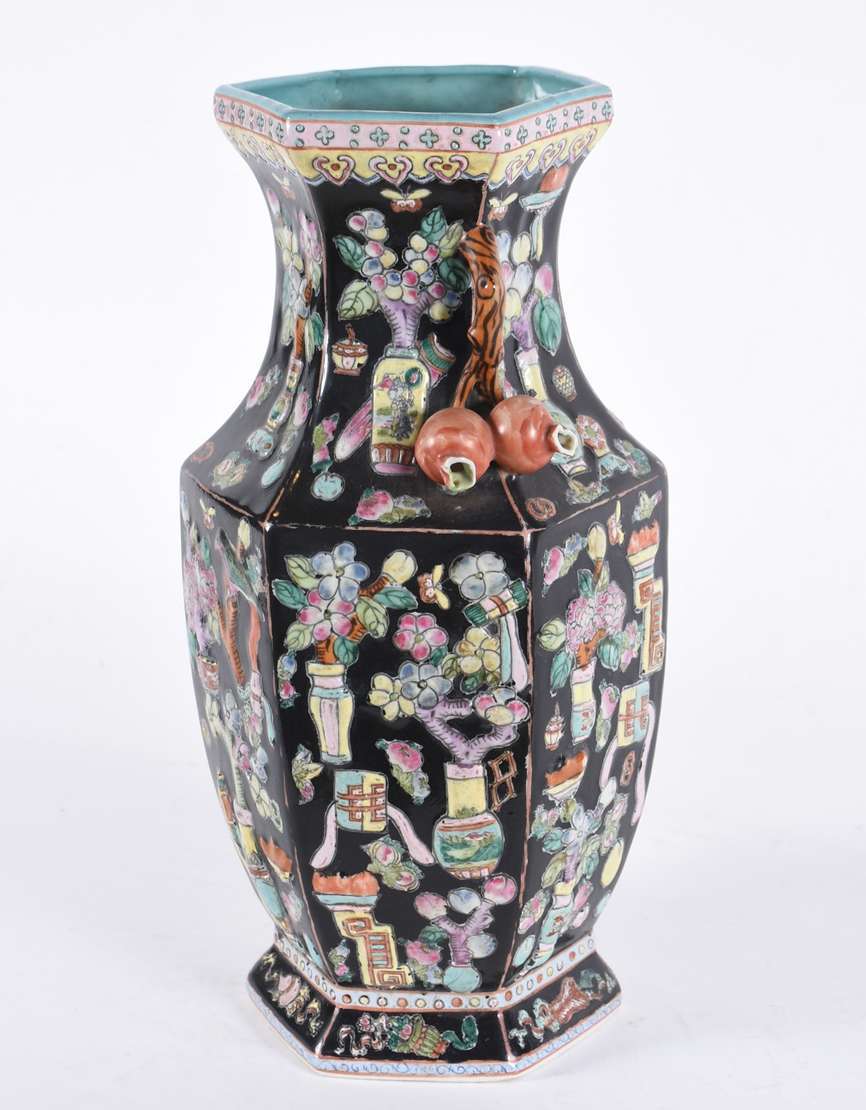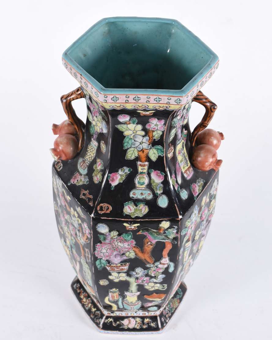 Par de vasos sextavado de cerâmica oriental com cenas em policromia.