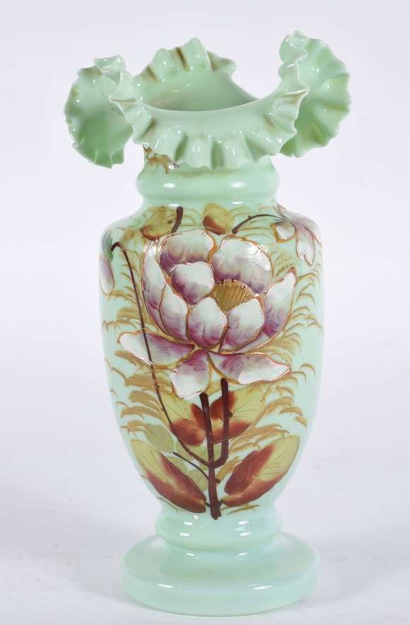 Vaso de opalina verde decorada com flores em policromia, borda feitio babado.
