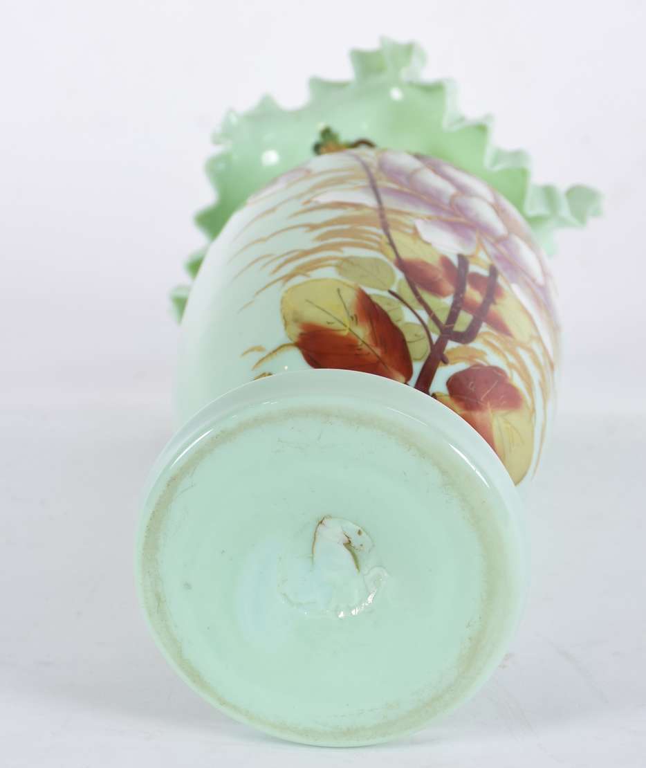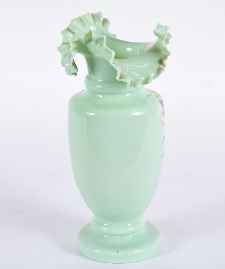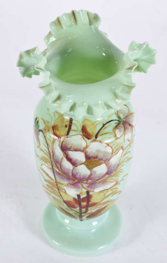 Dois vasos de opalina com flores em policromia, bases de madeira.