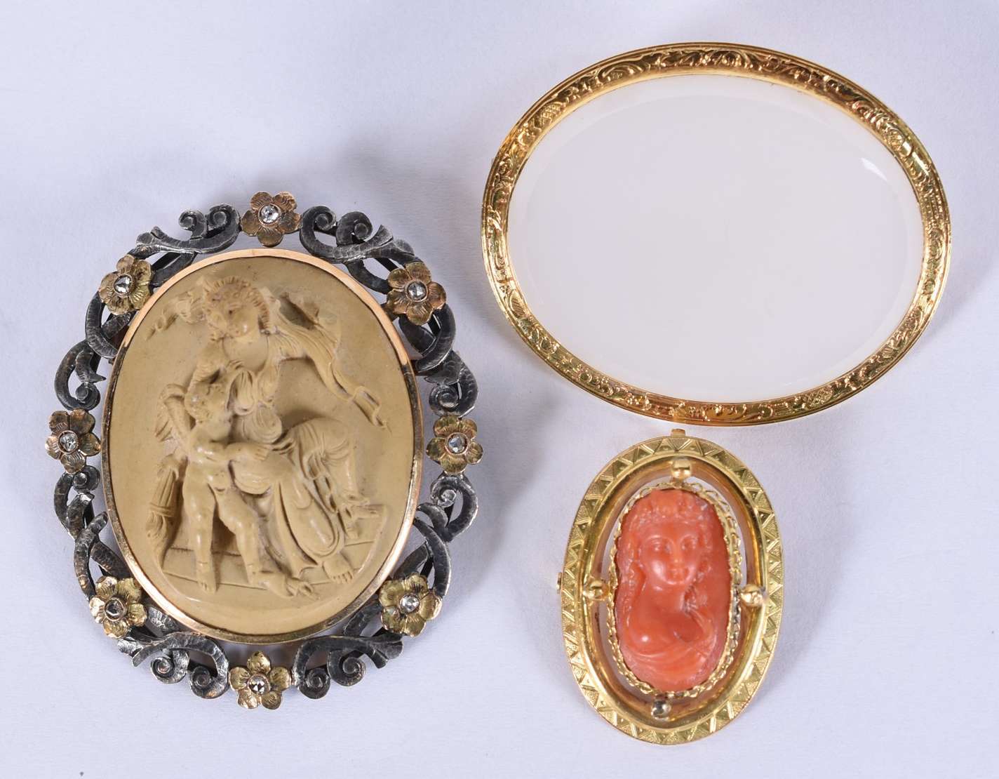 Quatro berloques, sendo: 3 figas e dente com terminações de ouro baixo.