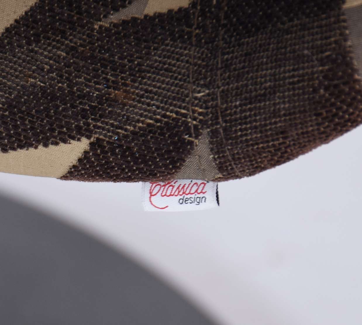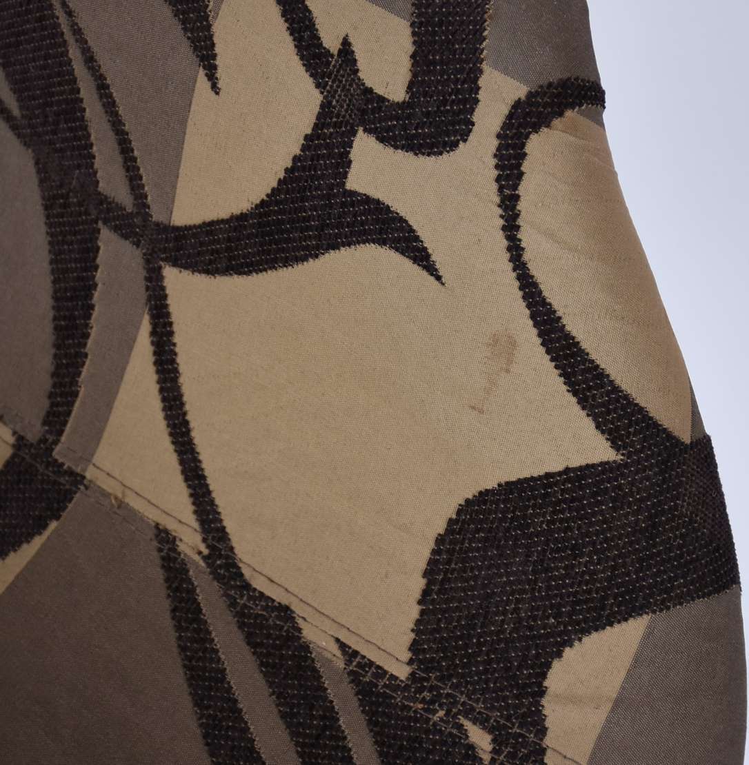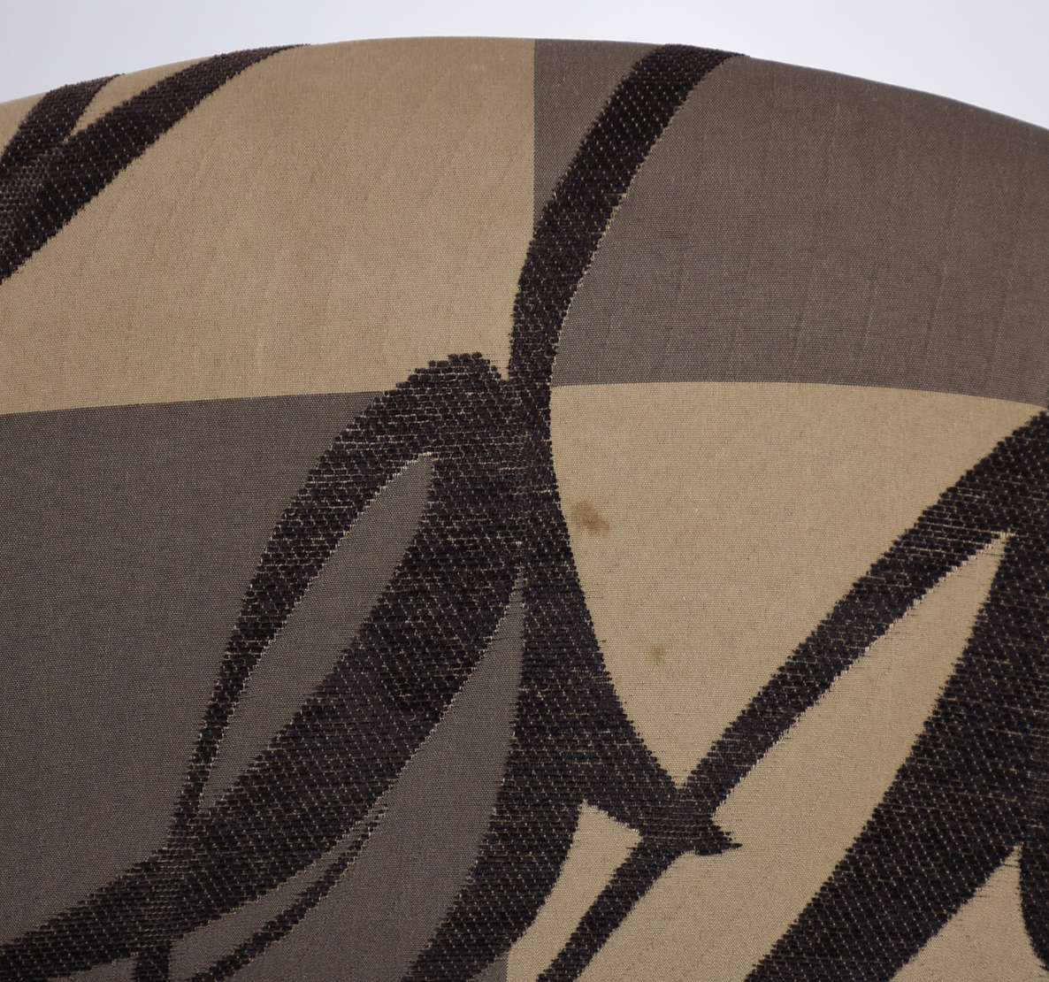 Sofá para 2 lugares com puff estofado e forrado com tecido listrado na cor ferrugem e bege, tecido com pequenos desga...