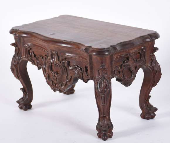 Mesa de encostar de madeira nobre, saia recortada com entalhes e vazados, pernas arqueadas.