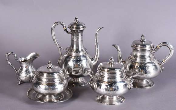 Excepcional baixela para chá e café de prata francesa contrastada, ricamente trabalhada em guilhochês e cinzelados, r...