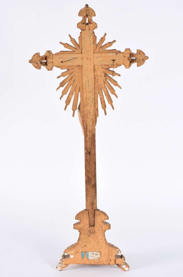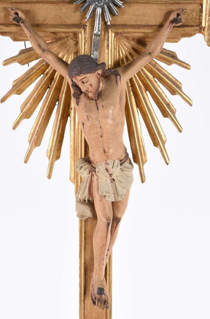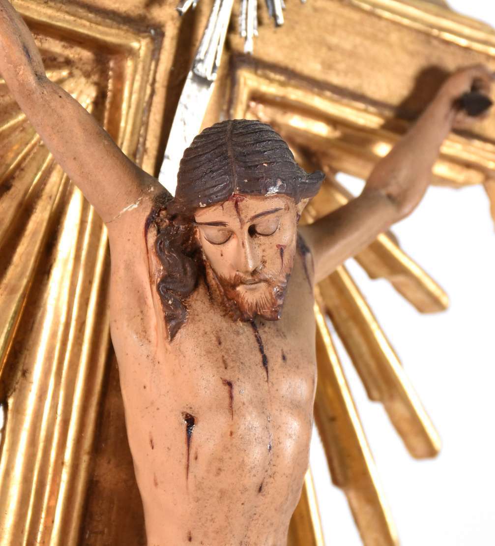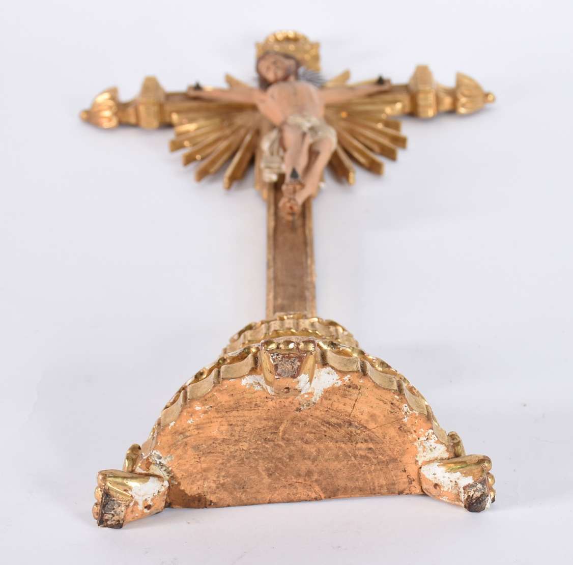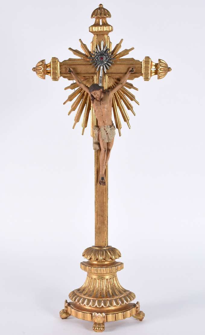 Crucifixo de madeira dourada com figura de Cristo ricamente entalhada e policromada, acompanha resplendor de prata.